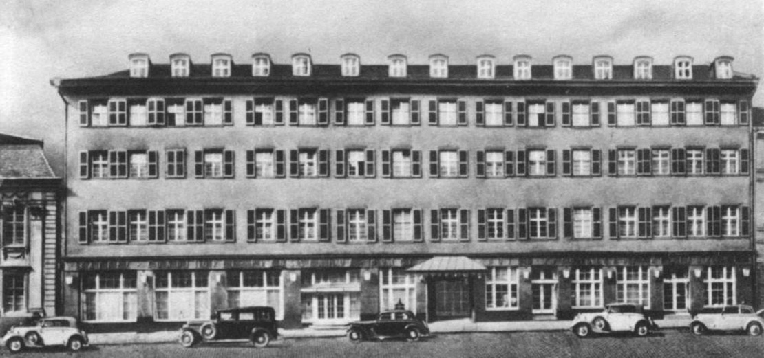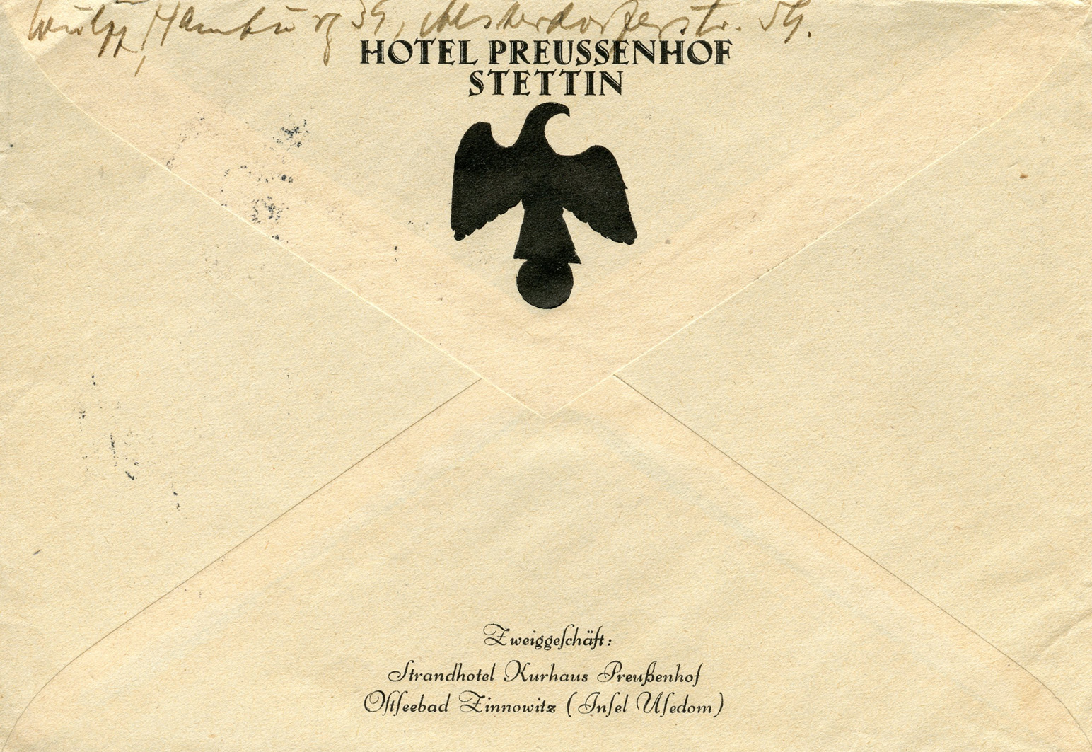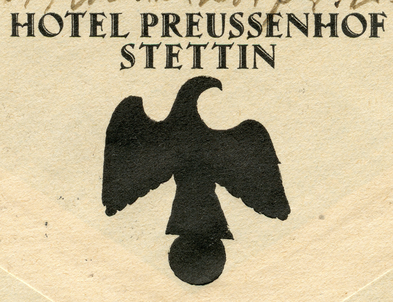 [Below: The reverse of an evelope from the 'Hotel Preussenhof' in Stettin. This is an odd design, like a silhouette of a Third Reich eagle from behind that is sitting on a swastika in a wreath. Stettin, like so much of Germany's land and resources, was stolen after WW2. It is now a part of Poland and is named 'Szczecin'...]