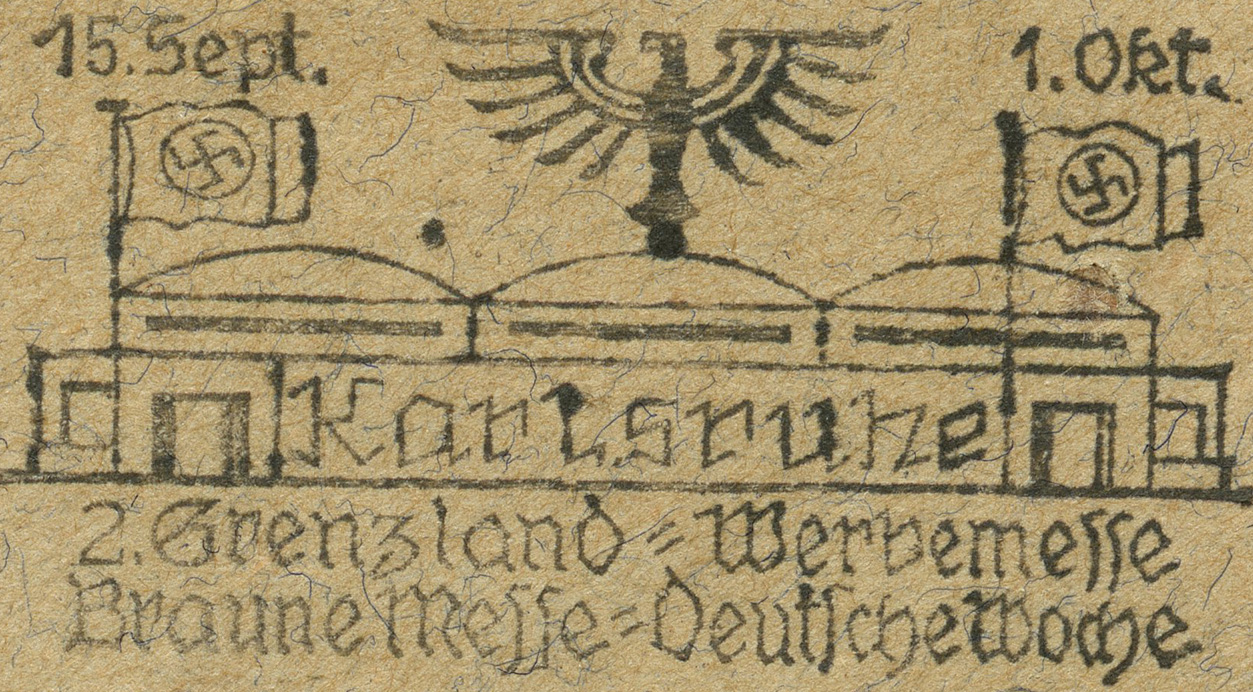 [Below: Here is an interesting eagle found on an envelope postmarked on September 7, 1934 in Carlsruhe. 'Karlsruhe