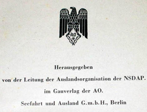 [Below: Herausgegeben von der Leitung der Auslandsorganisation der NSDAP. im Gauverlag der AO. Seefahrt und Ausland NSDAPAO (Issued by the management of the NSDAP's foreign organization. in the Gauverlag of the AO. Seafaring and abroad.), circa 1942.]
