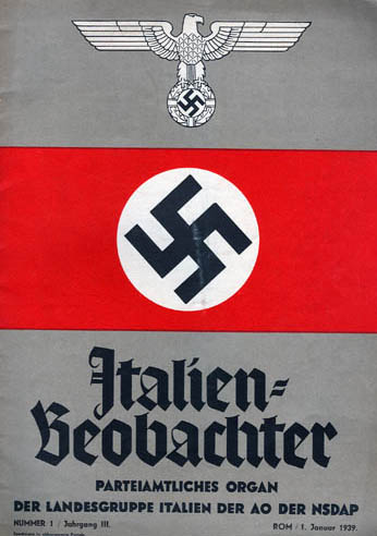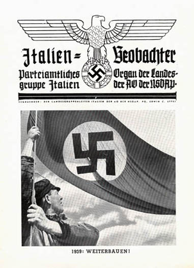 [Below: This is from the NSDAP/AO - the NSDAP/AO was the foreign organization branch of the National Socialist German Workers Party (NSDAP), Italian-Beobachter Parteiamtliches Organ der Landesgruppe Italien der AO der NSDAP (Italian Observer -Official party organ of the National Group Italy of the AO of the NSDAP), Italy, circa 1939.]