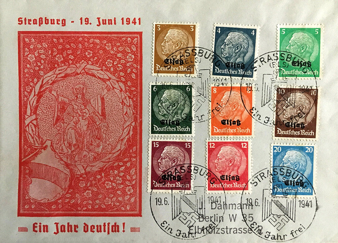 [Below: This envelope celebrates Strassburg's one year return to Germany ('Ein Jahr deutsch!' = 'One Year German!'). Strassburg had been fought over a handful of times in the past centuries (since 1681), but in 1871, after the Franco-Prussian war, Strassburg became a part of the German Empire. Germany did a massive rebuild of the city and invested untold Reichsmarks. After WWI Strassburg was handed over to France. After France was defeated in WWII in 1940 it returned to Germany. However, after WWII it was given to France... German is the main language spoken there today. You'll notice the German Hindenburg stamps below are overprinted 'Alsace'. Strassberg is the capital of Alsace, which is located on the west of the Rhine river. Okay, sorry for the history lesson. More like 'Stressburg', geez. Anyway, here are some unique eagles with shields on their breasts.]