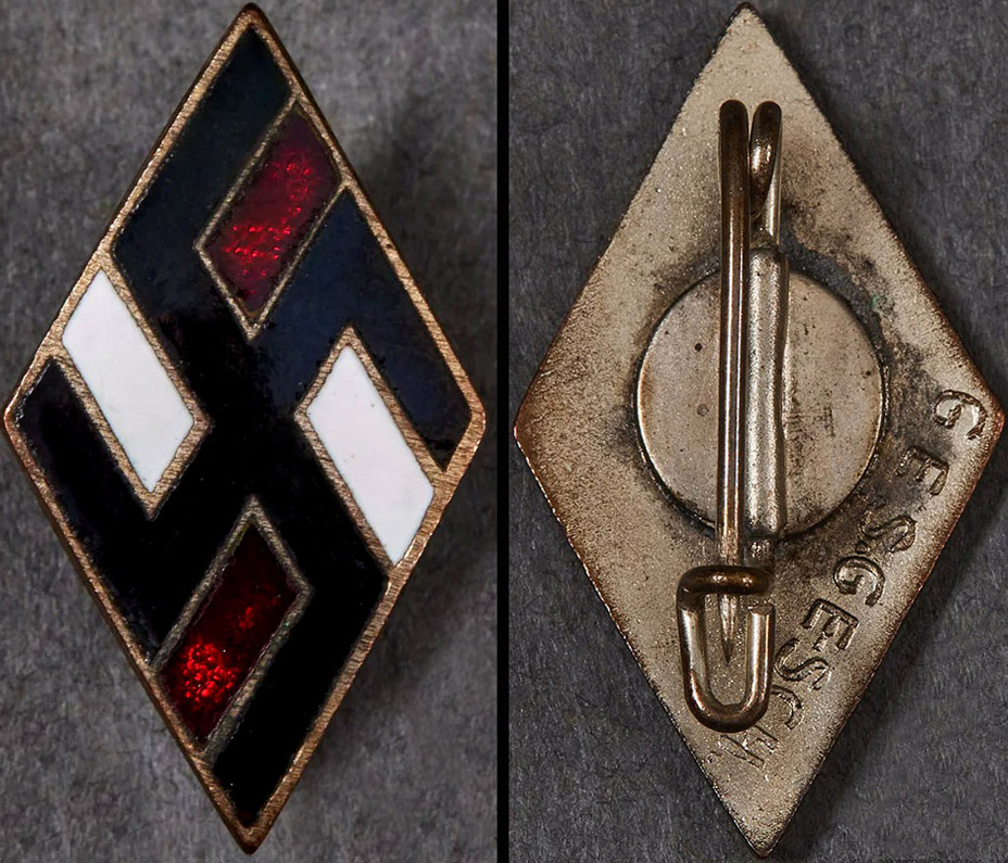 [Below: On the subject, here is an NSB (National Socialist Student League) membership diamond. This was given to members of the Hitler Youth who qualified to join the NSB. Front/back.]