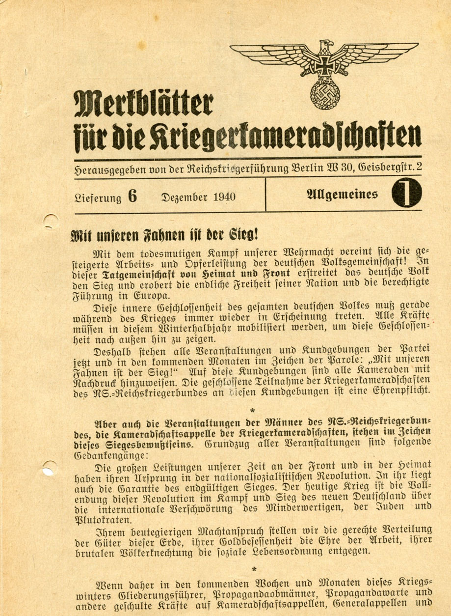 [Below: Here is a little newspaper called 'Merkblätter für die Kriegerkameradschaften' (translated literally as 'Leaflet for Warrior Fellowships'), December 1940.]