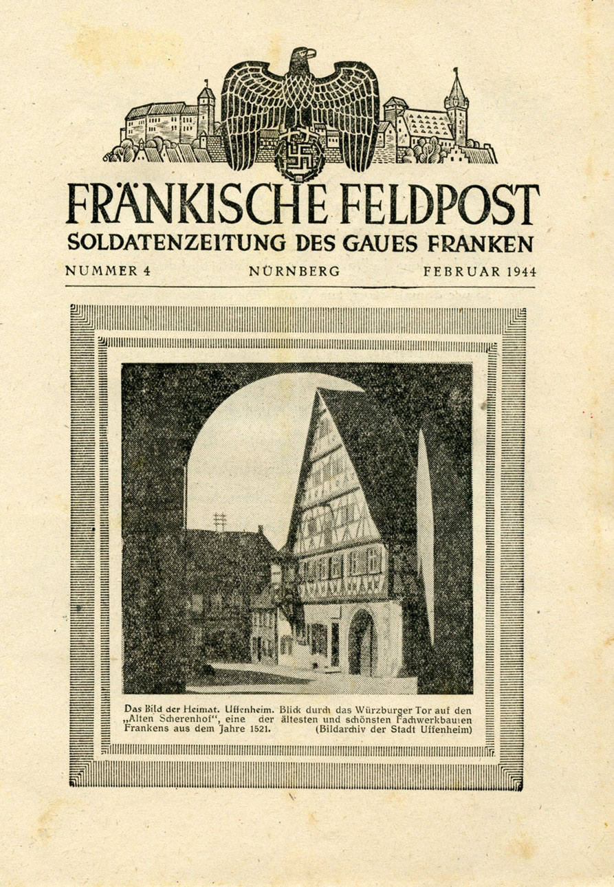 [Below: Fränkische Feldpost Soldatenzeitung des Gaues Franken. (Franconian field post soldiers newspaper of the Gaues Franconia). This was a small newspaper for soldiers in France, February 1944.]