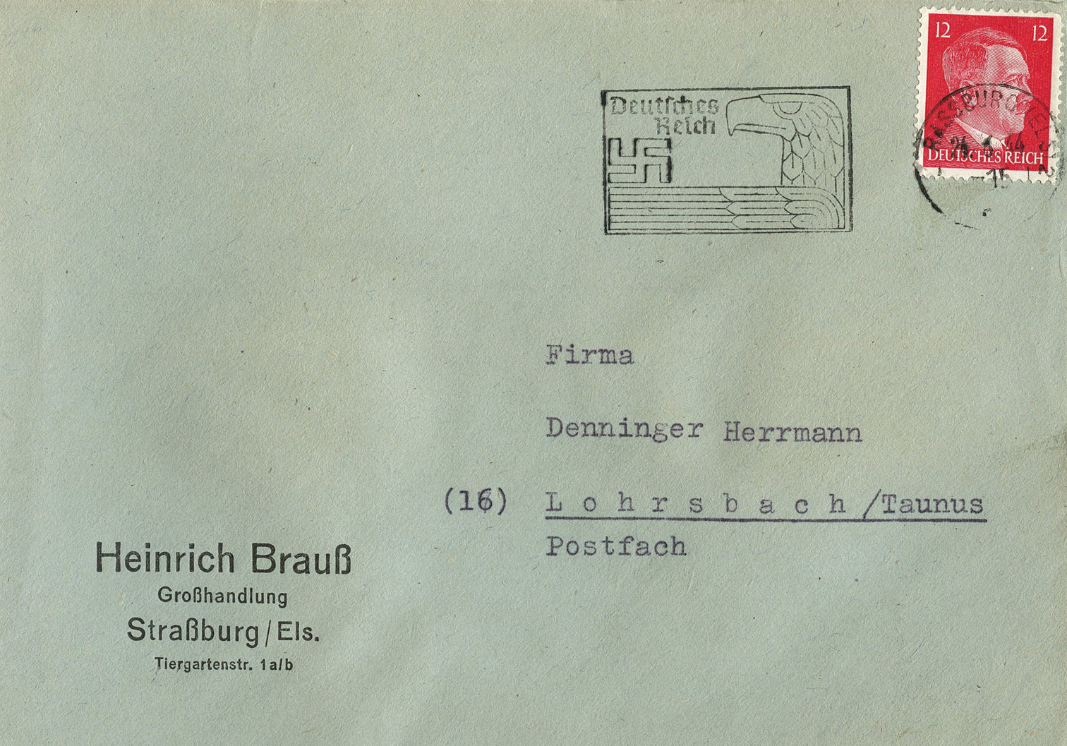 [Below: A black ink cancel example of meter mail from Strassburg. July 24, 1944.]