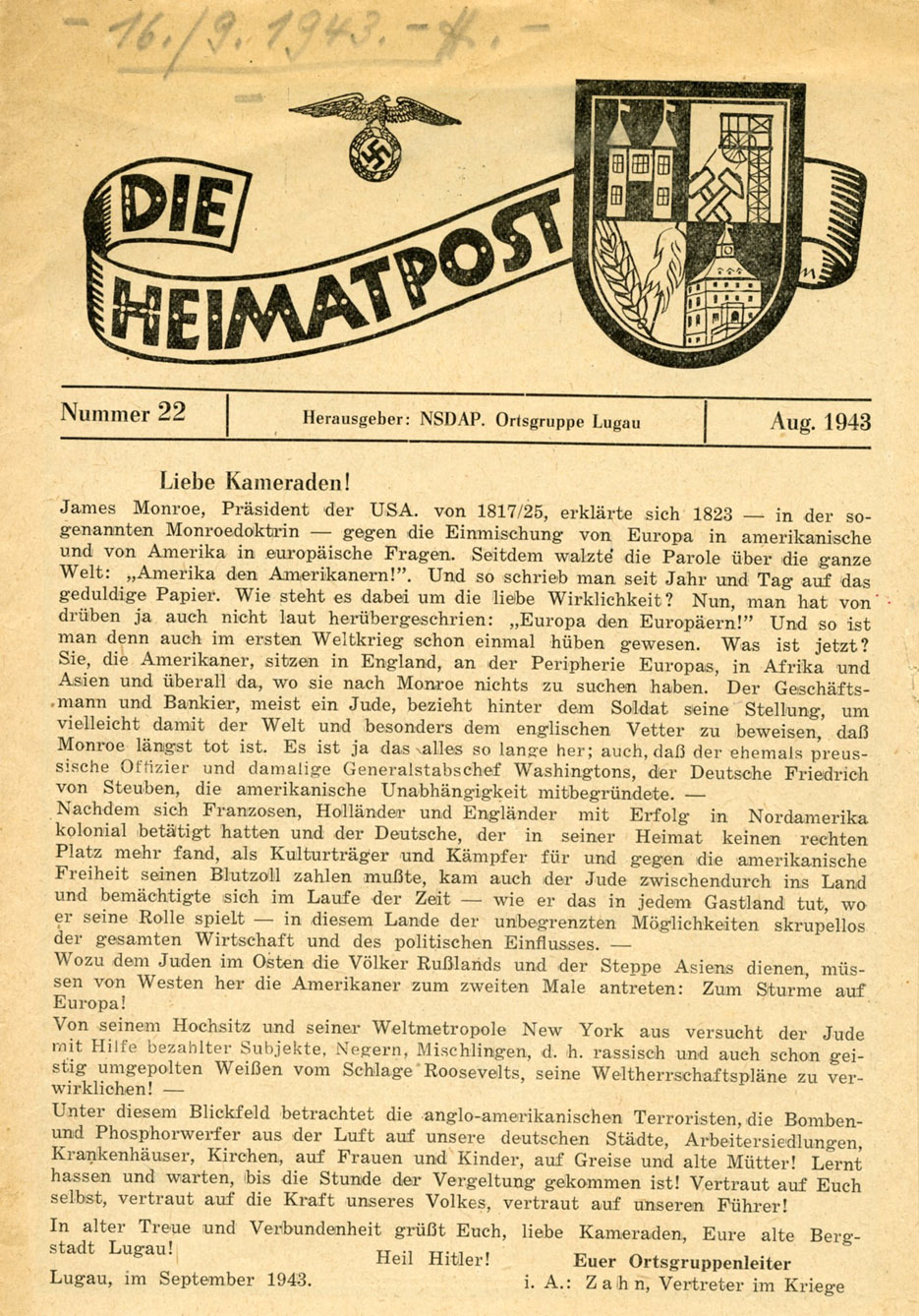 The coat of arms on top of the page of “Die Heimatpost” seems to be the city coat of arms of 1943.