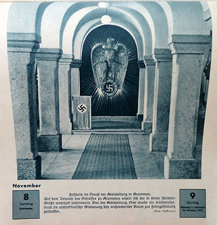 [Below: 1942 NSDAP district calendar showing a magical hall]