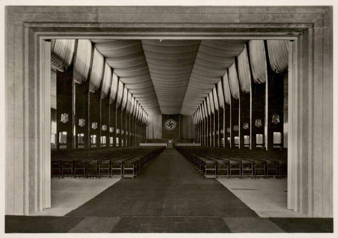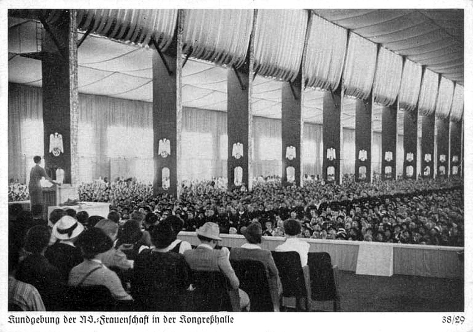 [Below: 1938 Reich Party Day. It says: 'Kundgebung der NS.=Frauenschaft in der Kongreßhalle' (Rally of the NS.=Frauenschaft {National Socialist Women's League} in the Congress Hall). I think this is Gertrud Klink, the leader of the NS-Frauenschaft, speaking.]