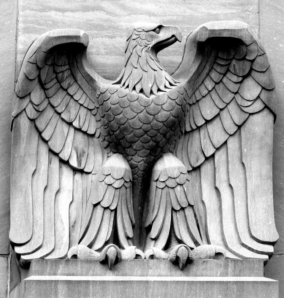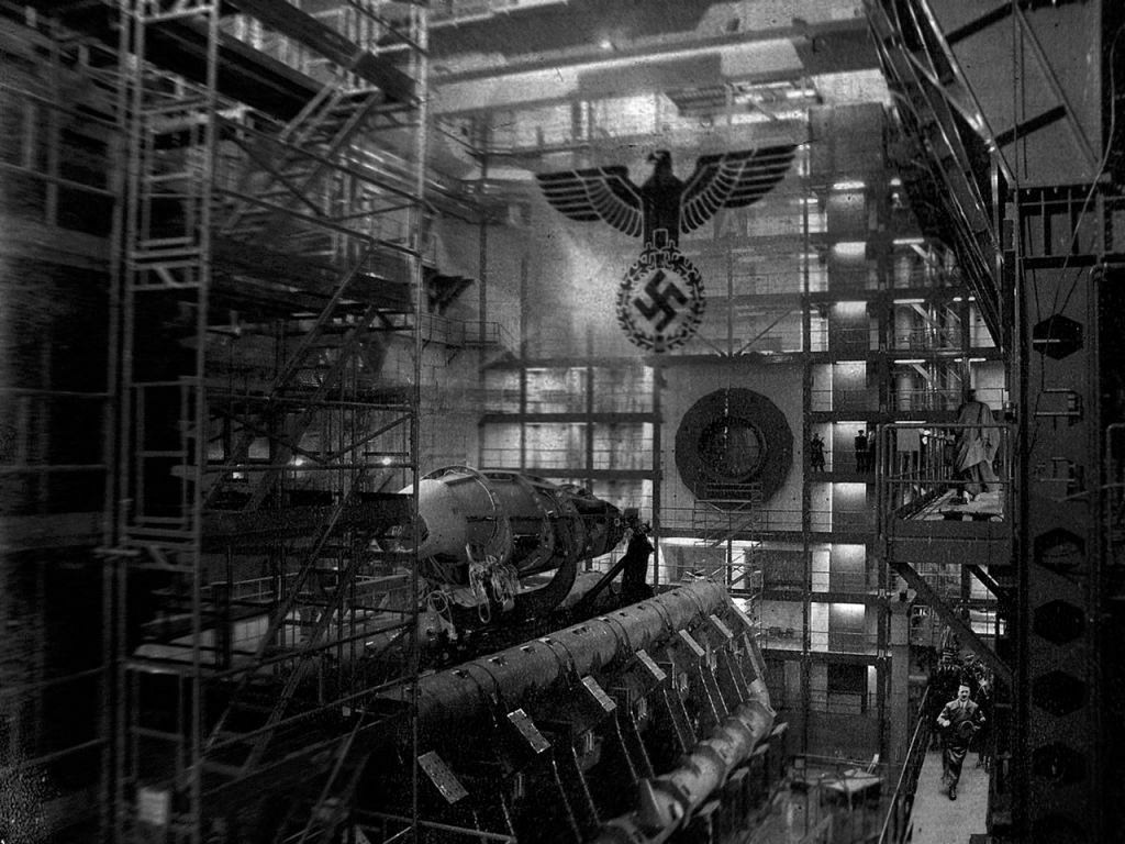 [Below: Wow. A factory of some sort. An amazing huge eagle. Note Adolf Hitler taking a tour of the factory, to the right/bottom!]