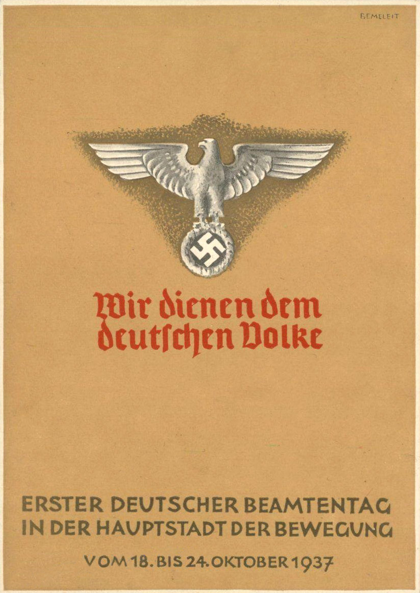 [Below: Reverse of postcard showing eagle cancel. It says 'Erster deutscher Beamtentag - Hauptstadt der Bewegung' (First German Civil Servants Day - Capital of the Movement)]