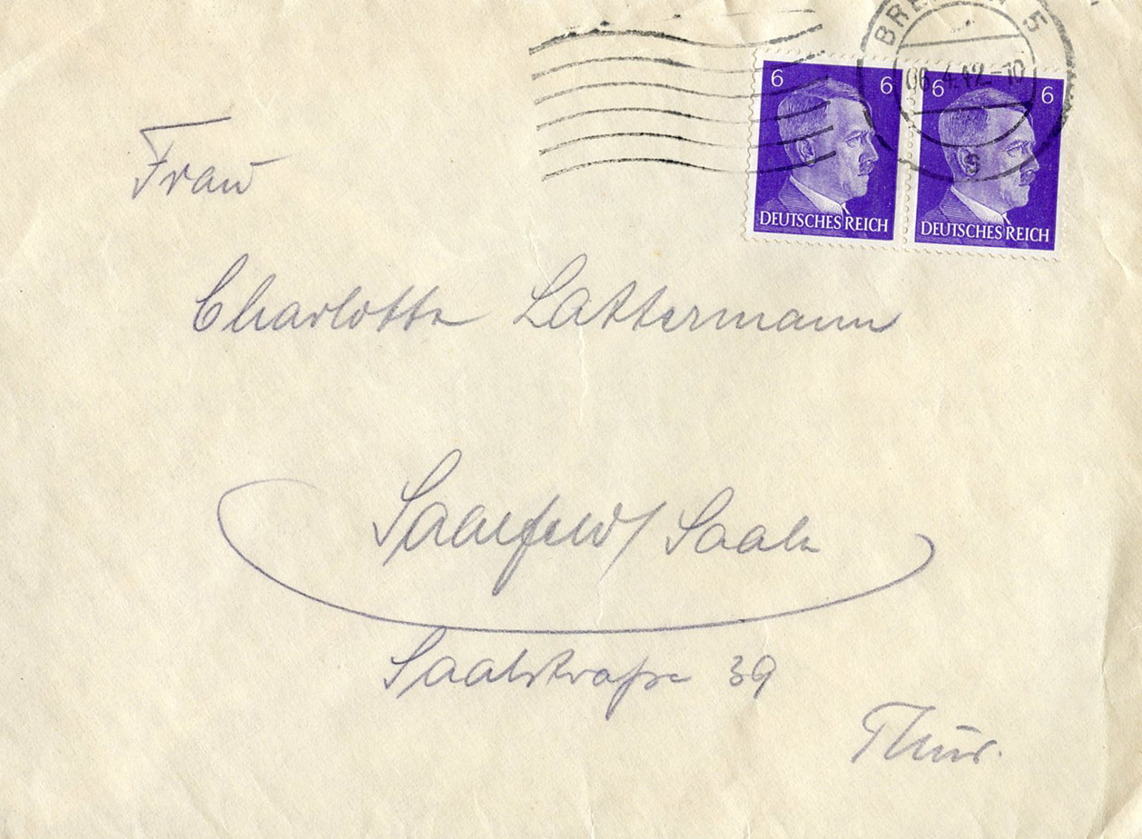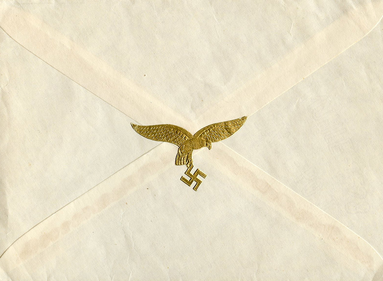 [Below: Pretty innocent-looking envelope with a couple of common Adolf Hitler postage stamps... but check out the back of this.]