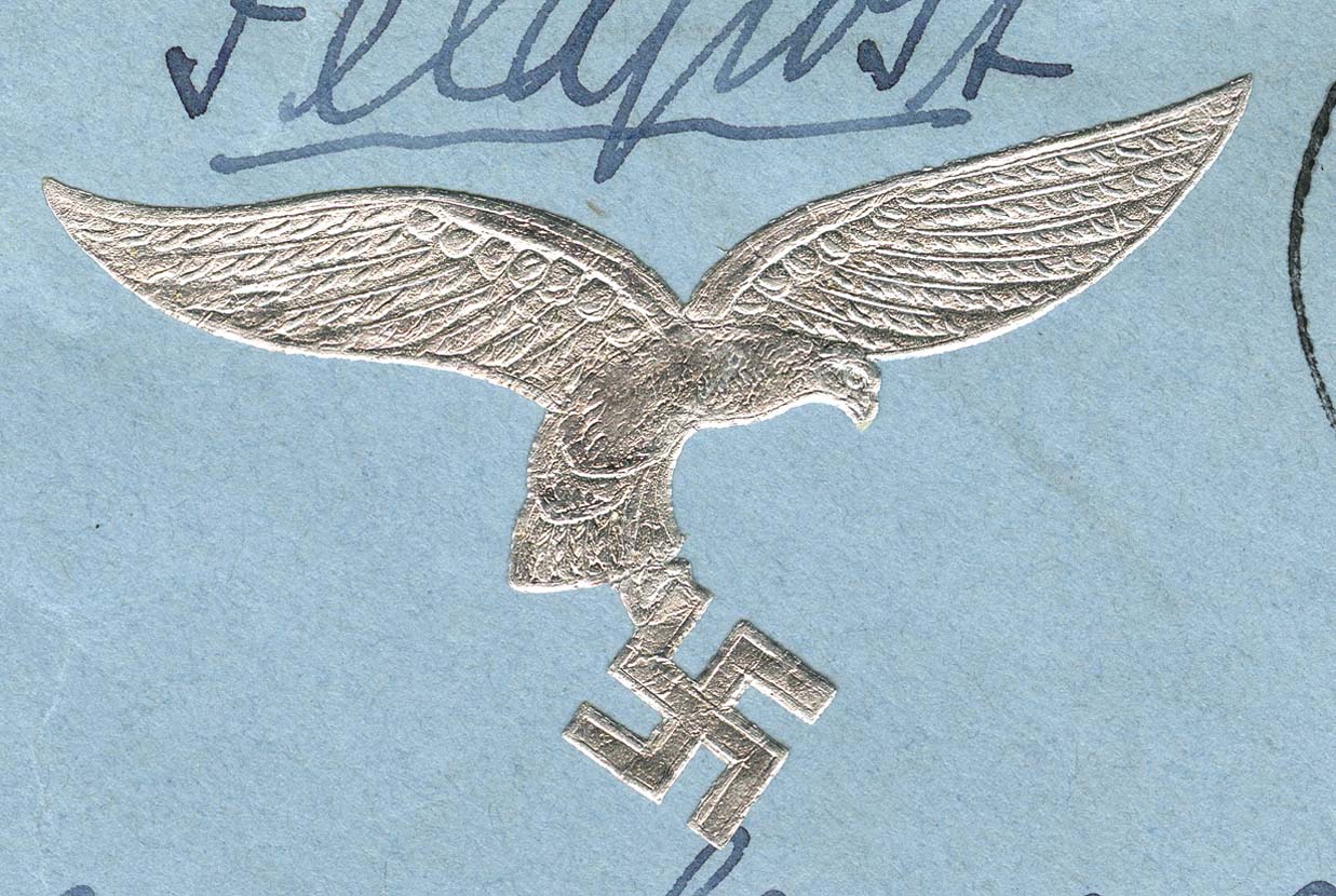 [Below: Here's the same eagle in silver on a Feldpost envelope from Batterie Reserve-Flak-Abteilung.]