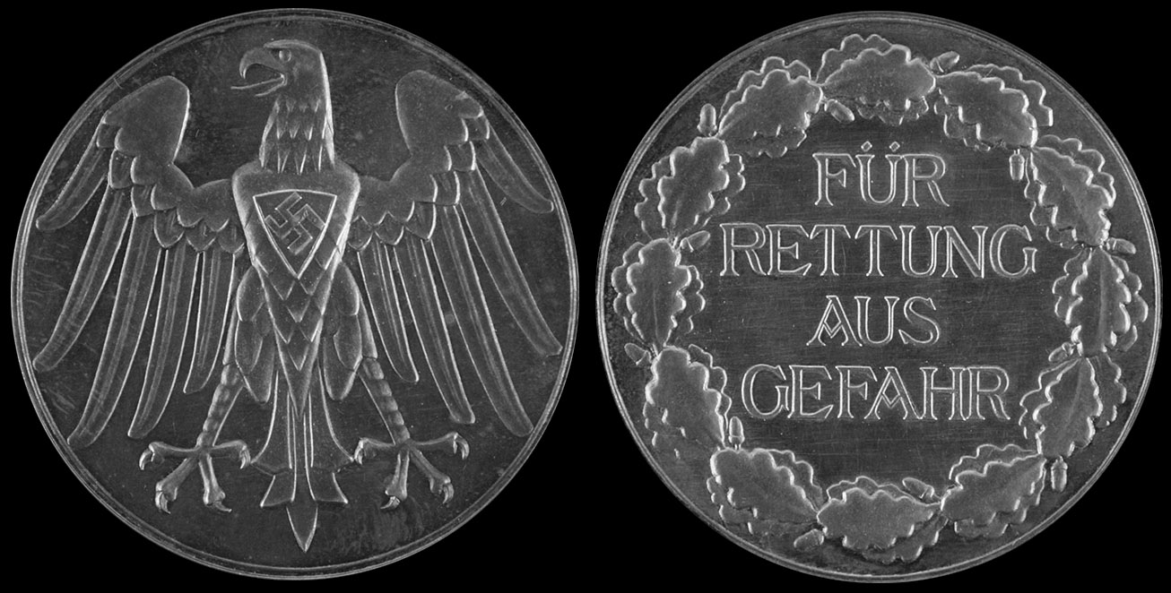 [Below: The eagle above finally got its swastika! Here is a stunning German Life Saving Association medal. It says: 'Für Rettung aus Gefahr' (For Rescue from Danger)]