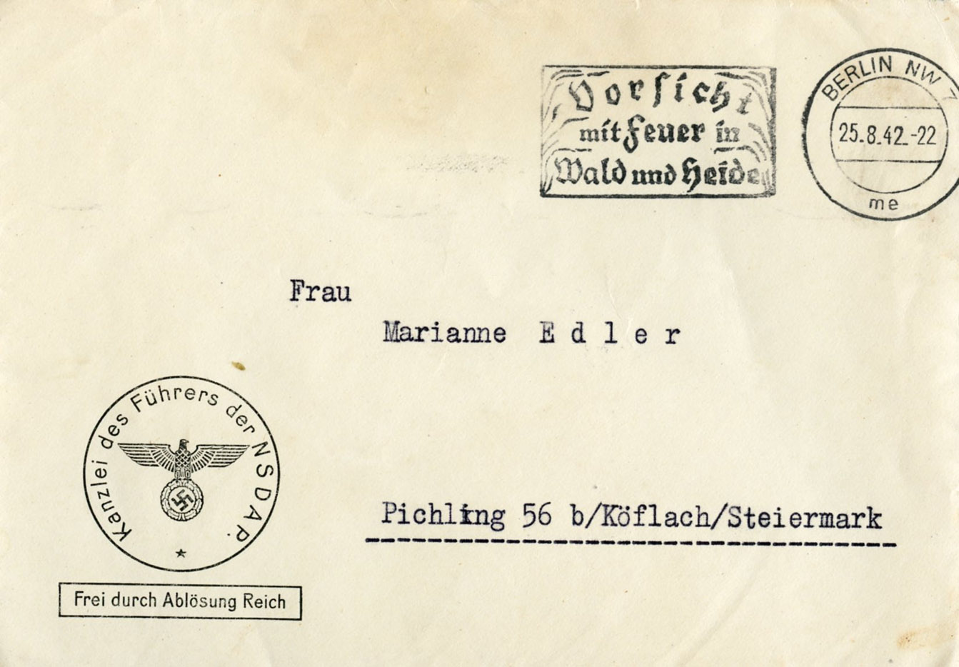 [Below: Now here is something rare and super cool. This is an envelope and letter from the Office of the Führer of the National Socialist Worker's Party -- Adolf Hitler! It is from August 25, 1942. The cancel says: