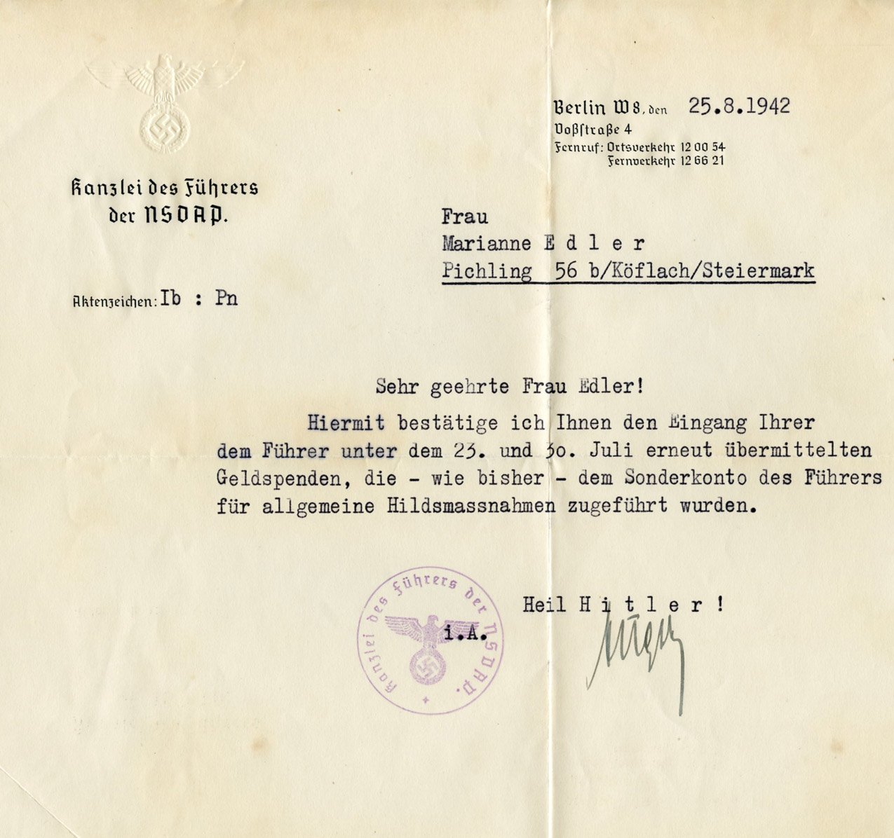 Hiermit bestätige ich Ihnen den Eingang Ihrer dem Führer unter dem 23. und 30. Juli erneut übermittelten Geldspenden, die - wie bisher - dem Sonderkonto des Führers für allgemeine Hildsmassnahmen zugeführt wurden.'