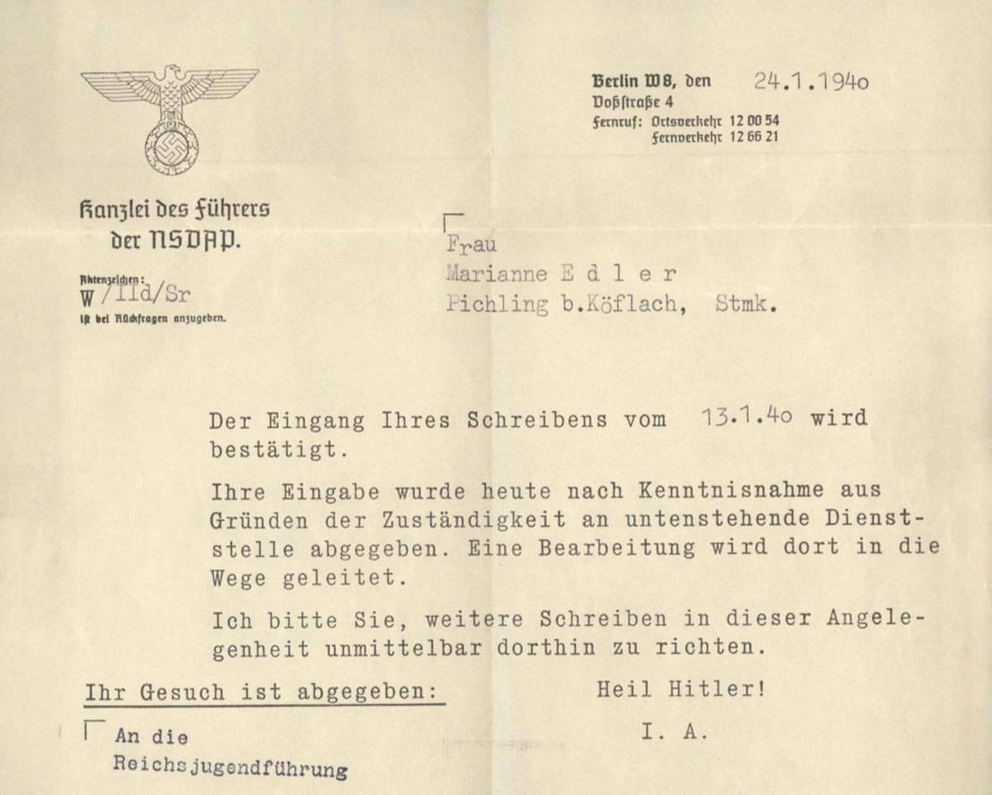 (Dear Ms. Edler! I hereby confirm receipt of the monetary donations you sent to the Führer on July 23rd and 30th, which - as before - were transferred to the Führer's special account for general aid measures.)]