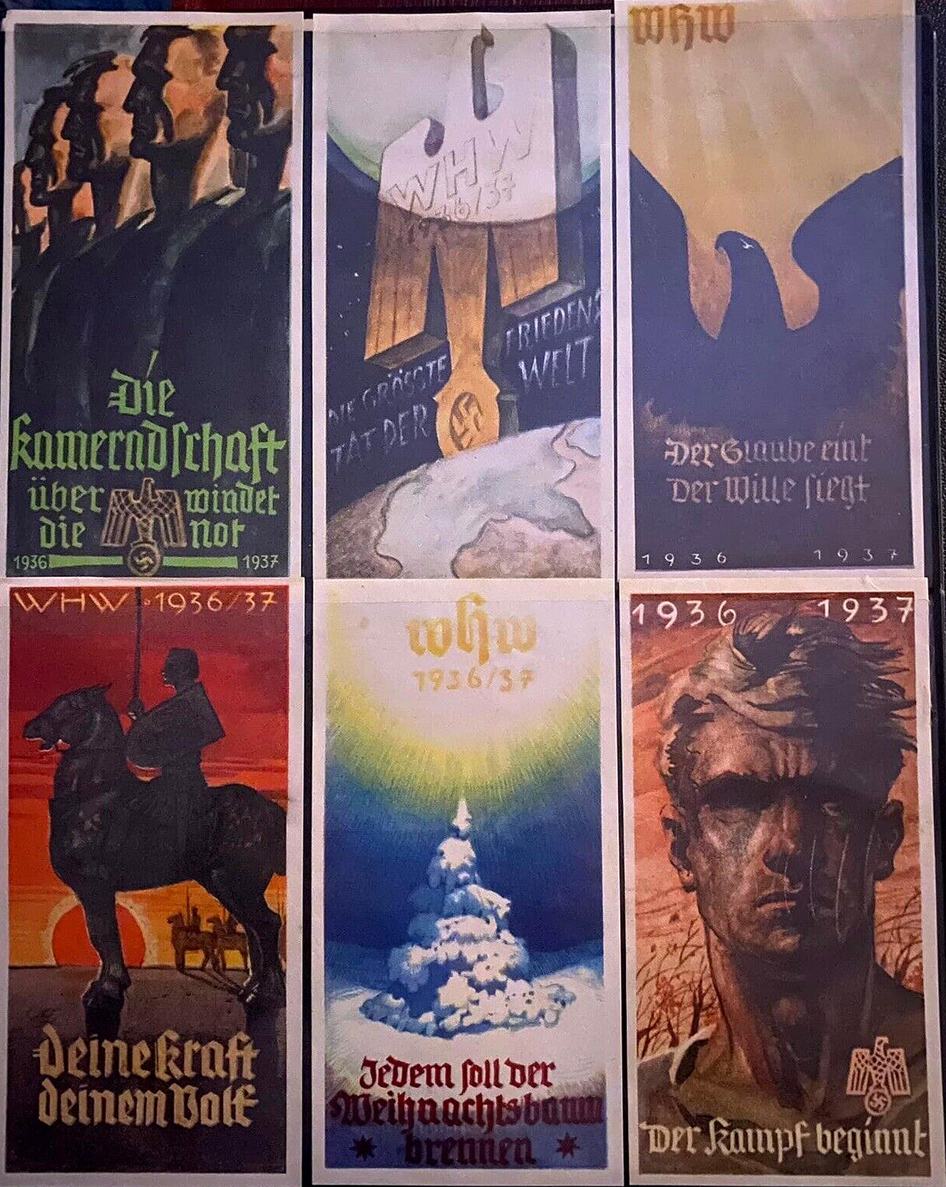 [Below: Sheet of donation stamps from 1936-37 for the 'Winterhilfswerk des Deutschen Volkes' (Winter Relief of the German People). These say 'Die kameradschaft überwindet die Not' (Comradeship Overcomes Adversity).]