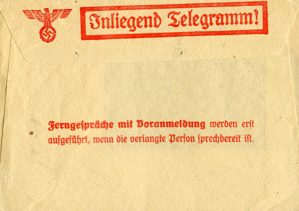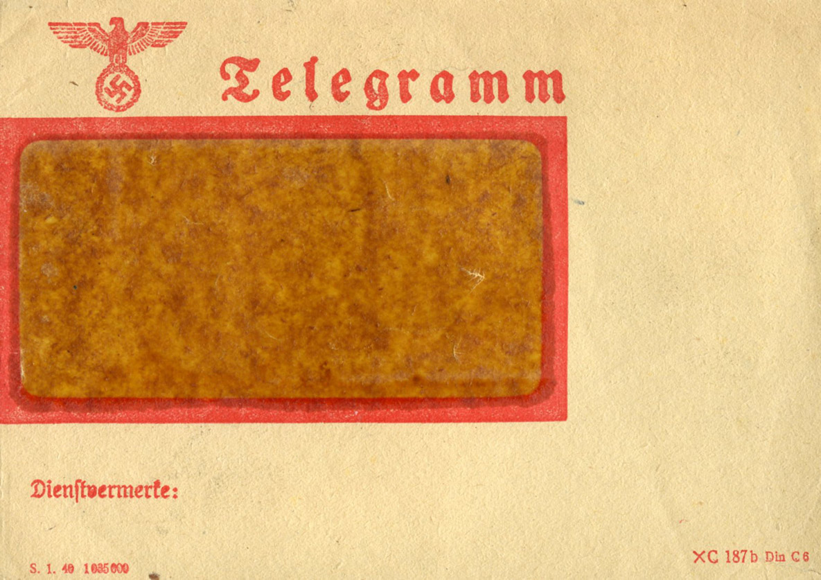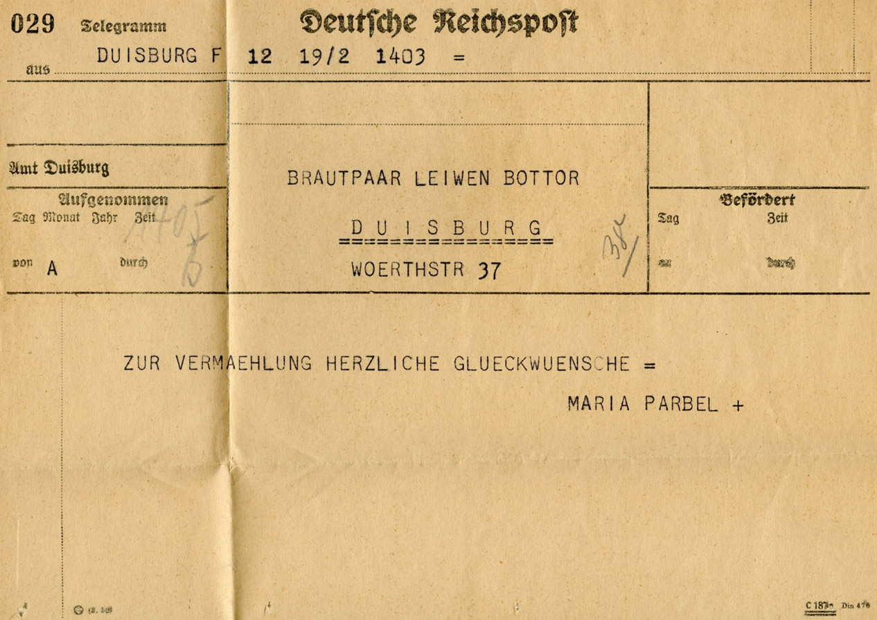 [Below: The telegram. It says: 'Zur Vermaehlung Herzliche Glueckwuensche' (Congratulations on the marriage).]