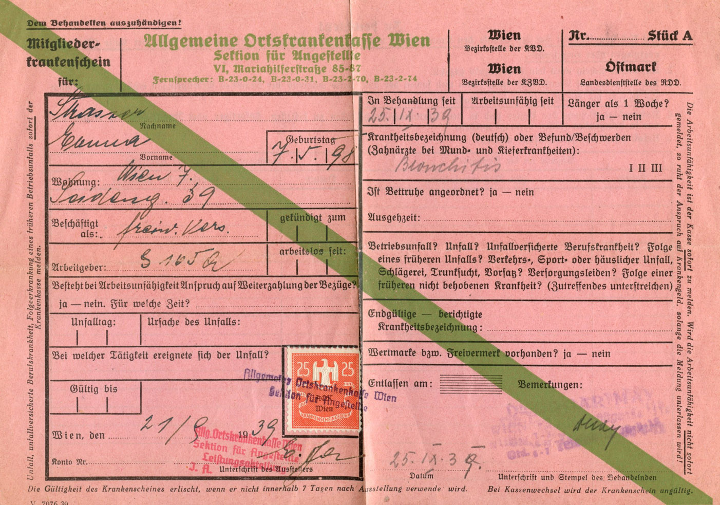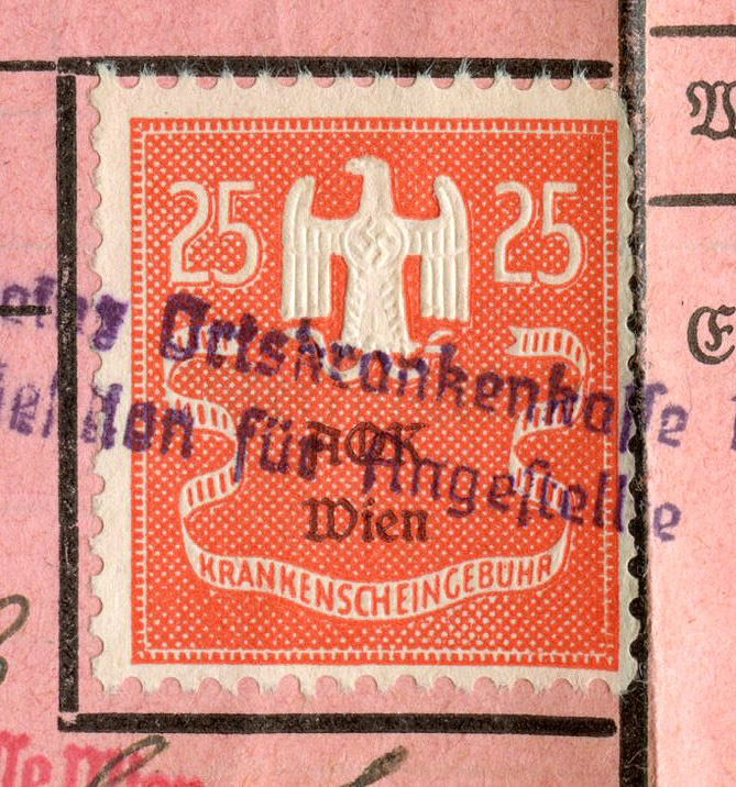 [Below: This is a medical revenue from Vienna. It has a rather odd little stamp. On the bottom of the stamp it says 'Krankenscheingebühr' (Sickness certificate fee). These stamps, especially on a document, are quite scarce.]