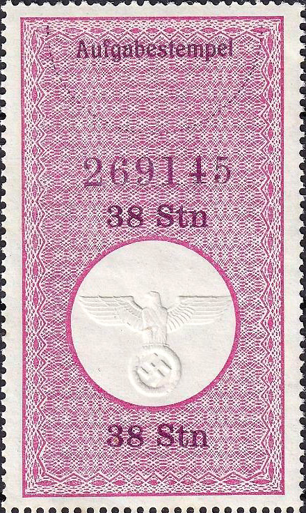 [Below: This rather odd-looking stamp was apparently used on postal money orders. 'Aufgabestempel' just means 'posting stamp'...]