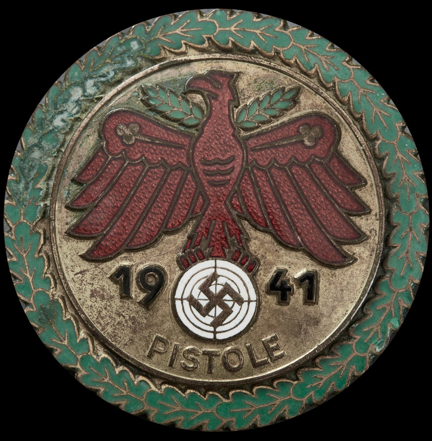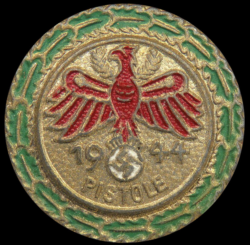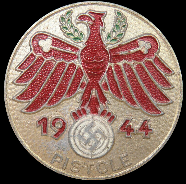 [Below: Here are a few examples of other awards like that above. This is a 1944 pistol shooting award badge. The drop in quality is very noticeable, no doubt due to war shortages. This is made from zinc, an emergency alloy the Germans used for many badges and medals in the final years. Even coins were eventually made from zinc.]