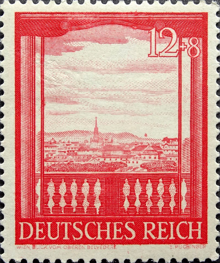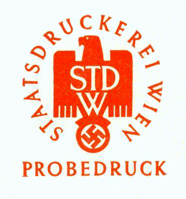 [Below: 'Staatsdruckerei Wien - Probedruck' (Vienna State Printing Office - Trial Print). This is taken from the front of a very rare folder containing an imperforate trial postage stamp, probably presented to someone in the government. The postage stamp within the folder, in an imperforate state, is obscenely rare, not even listed in the most respected and complete catalog of German stamps. The stamp design itself was released on September 16, 1941 and shows a design called 'View from the upper Belvedere' (12+8 pf). The Belvedere is a historic building complex in Vienna, Austria, consisting of two Baroque palaces the Orangery, and the Palace Stables.]