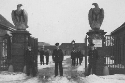 [Below: Another shot of Emanuel Moravec, standing before a rather odd-looking eagle. Ostrava, Czechoslovakia (Bohemia and Moravia), 1942]