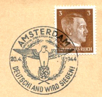 [Below: Here is a sharp-winged eagle from a cancel from German occupied Amsterdam, Adolf Hitler's 55th birthday, April 20, 1944.]