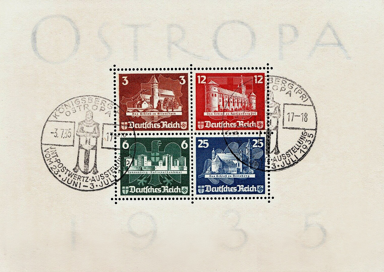 [Below: This is a souvenir sheet from June 1935 (Eastern Europe Stamp Exhibition in Konigsberg) showing an eagle outline on the 6 denomination. This sheet was originally released with acidic gum containing sulfuric acid, therefore many sheets show staining or even damage from the acid eating away the paper. Normally collectors want gum intact, but in this case it is perfectly acceptable to have no gum on this sheet, in fact it is preferable. Early on collectors soaked the gum off of some of these sheets protecting them for the future.]