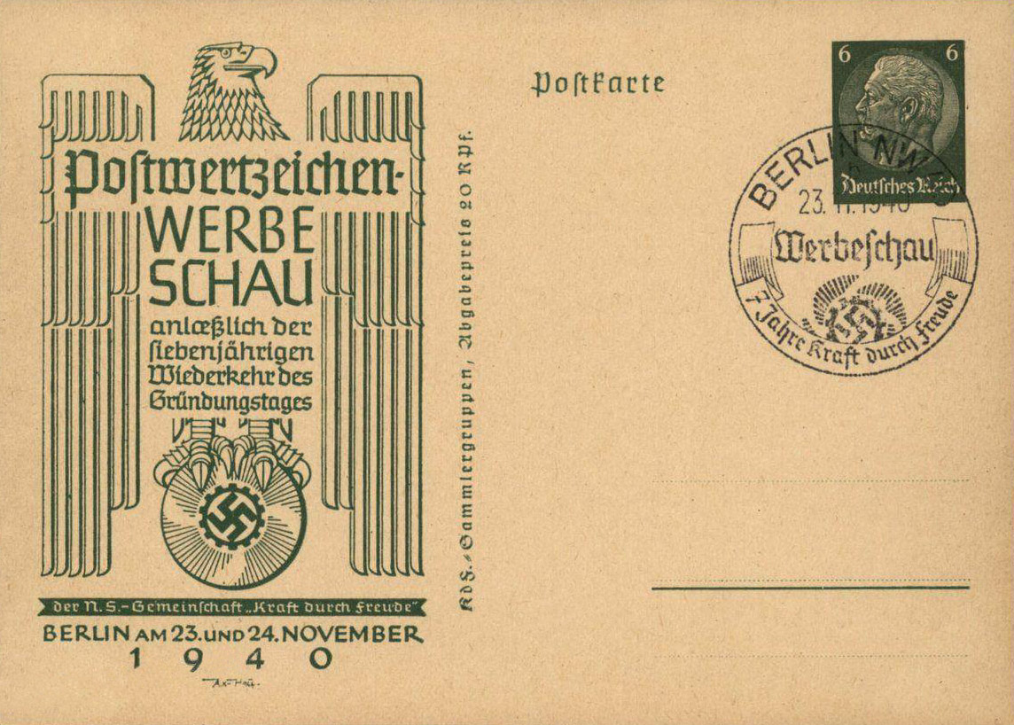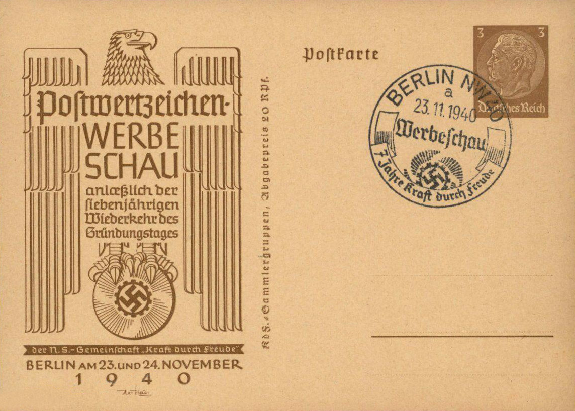 [Below: A postcard advertising a 'Postwertzeichen-Werbeschau'(Literally a 'Postage Stamp Advertising Show' i.e. a stamp show) held by the Strength through Joy (KdF) organization. 3 pf value.]