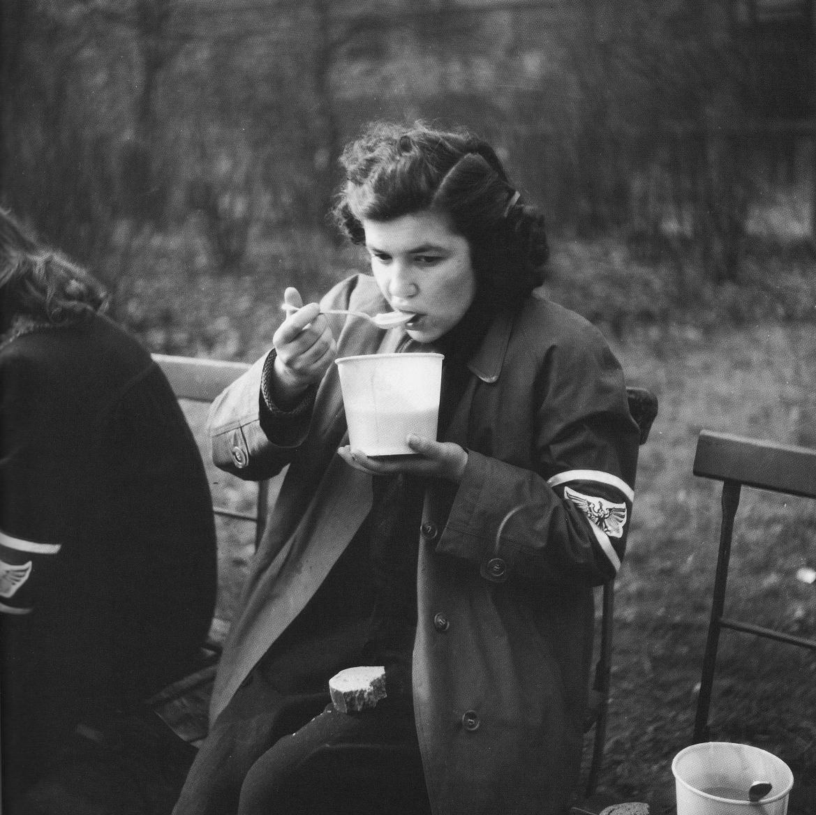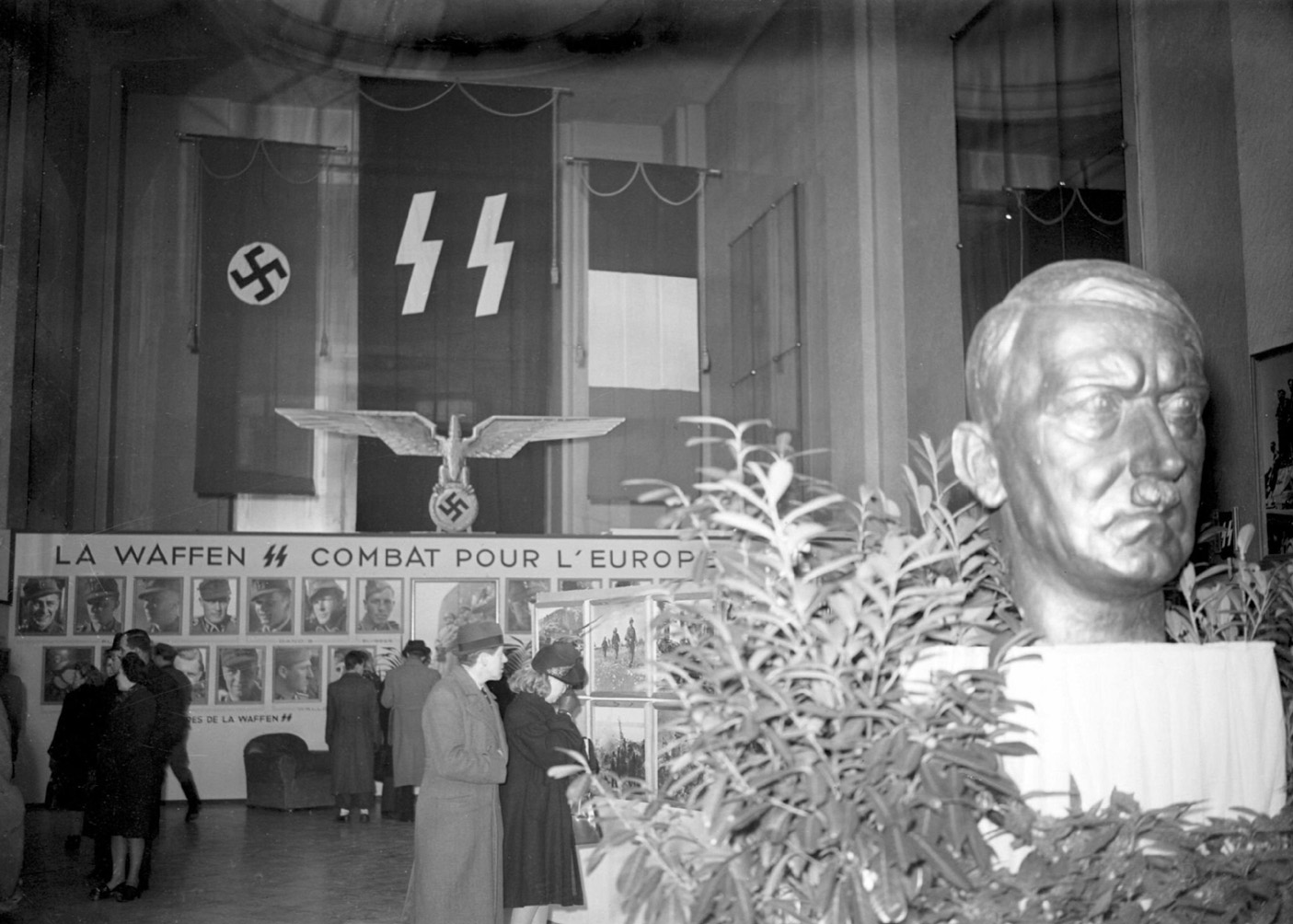 [Below: Photo exhibition showcasing combat photos of Waffen-SS soldiers on the Eastern Front. Paris, France, January 1944. 'La Waffen SS Combat Pour L'Europe' (The Waffen SS Fights For Europe). What's up with that weird swastika on that flag? Its arms are too short...]