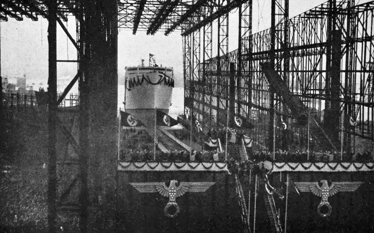 [Below: The "Strength Through Joy" flagship "Robert Ley". A beautiful marvel of its time, 25,000 tons. This shows the launching of the "Robert Ley".]