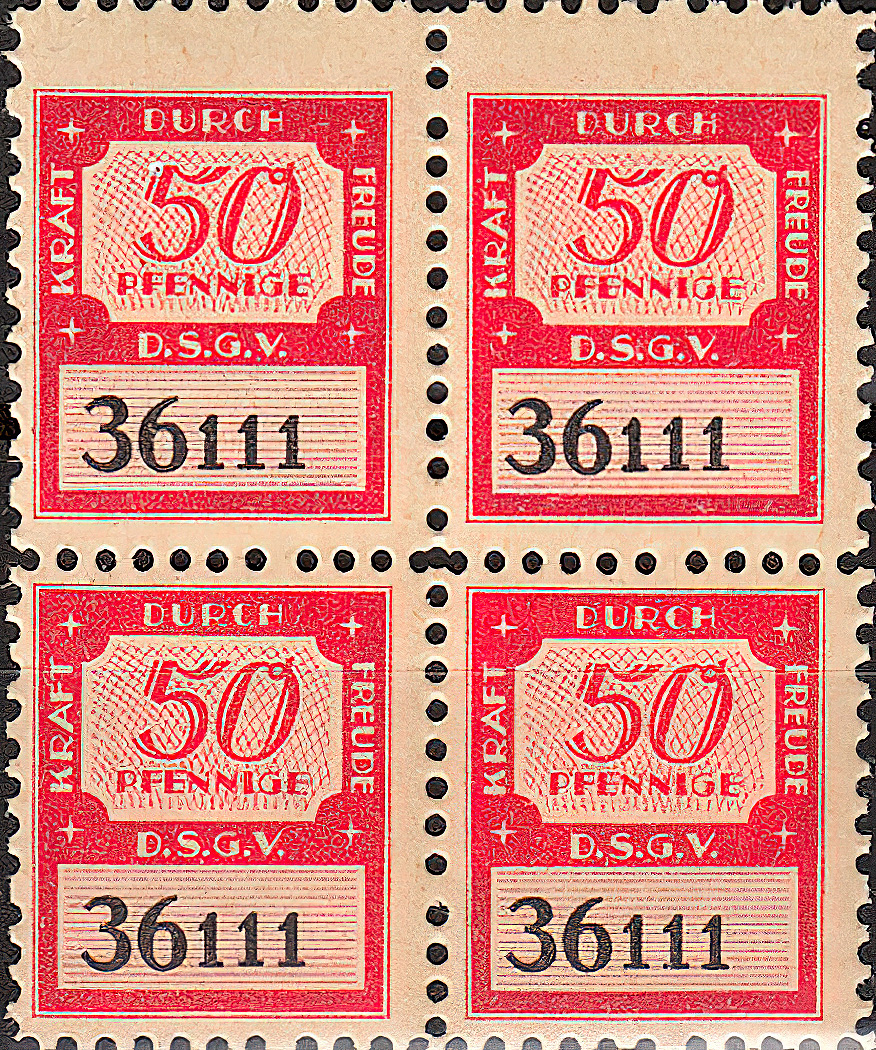 [Below: These are 'Kraft durch Freude Sparkassen' (Strength Through Joy Savings Banks) stamps, in a block of four.]