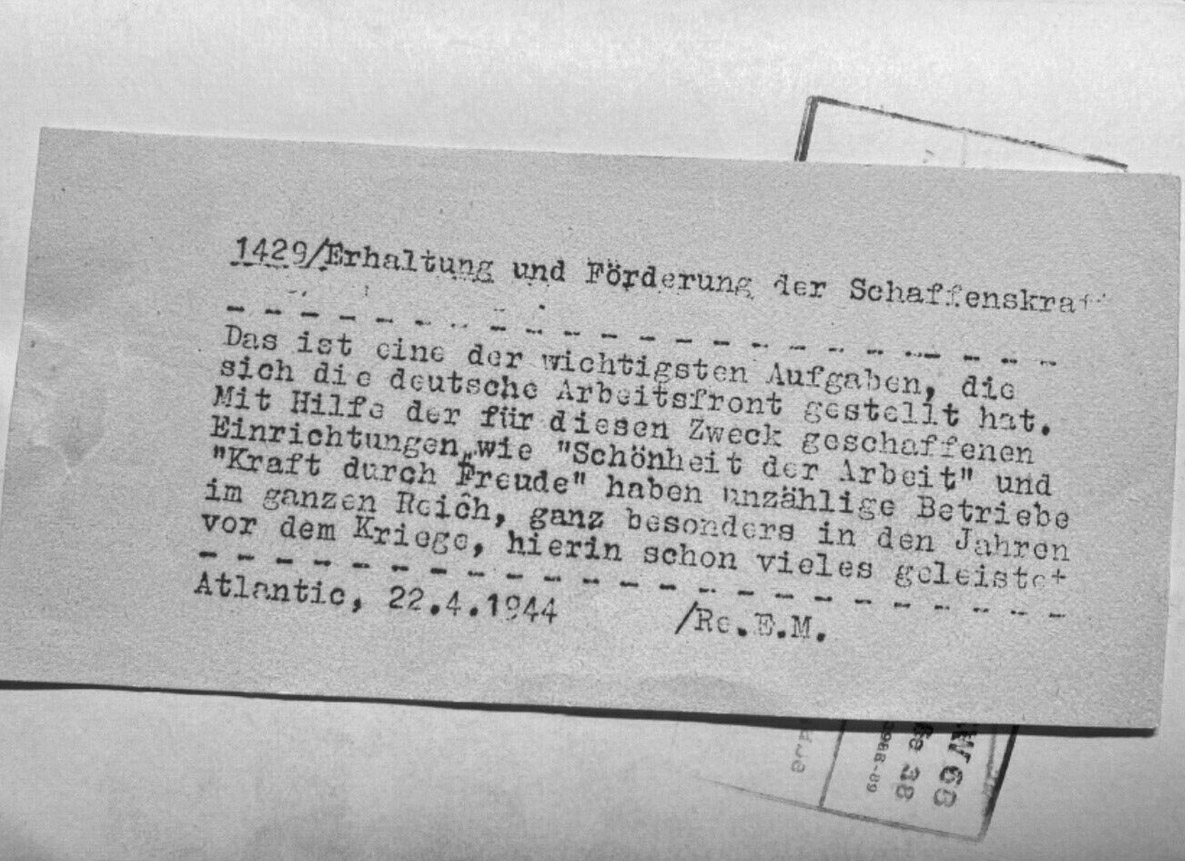 'Erhaltung und Förderung der Schaffenskraft Das ist eine der wichtigsten Aufgaben, die sich die deutsche Arbeitsfront gestellt hat. Mit Hilfe der für diesen Zweck geschaffenen Einrichtungen wie "Schönheit der Arbeit" und "Kraft durch Freude" haben unzählige Betriebe im ganzen Reich, ganz besonders in den Jahren vor dem Kriege, hierin schon vieles geleistet.