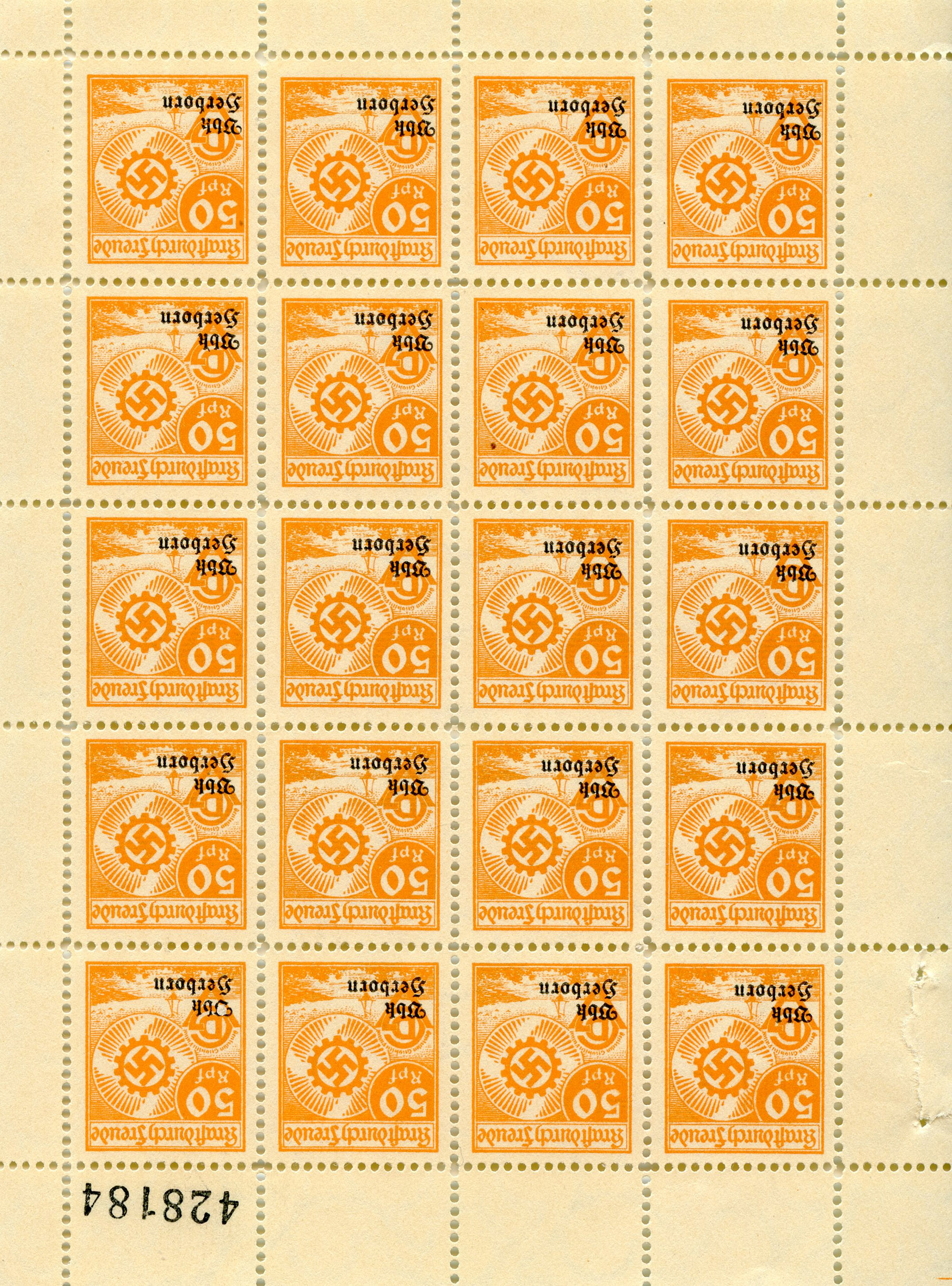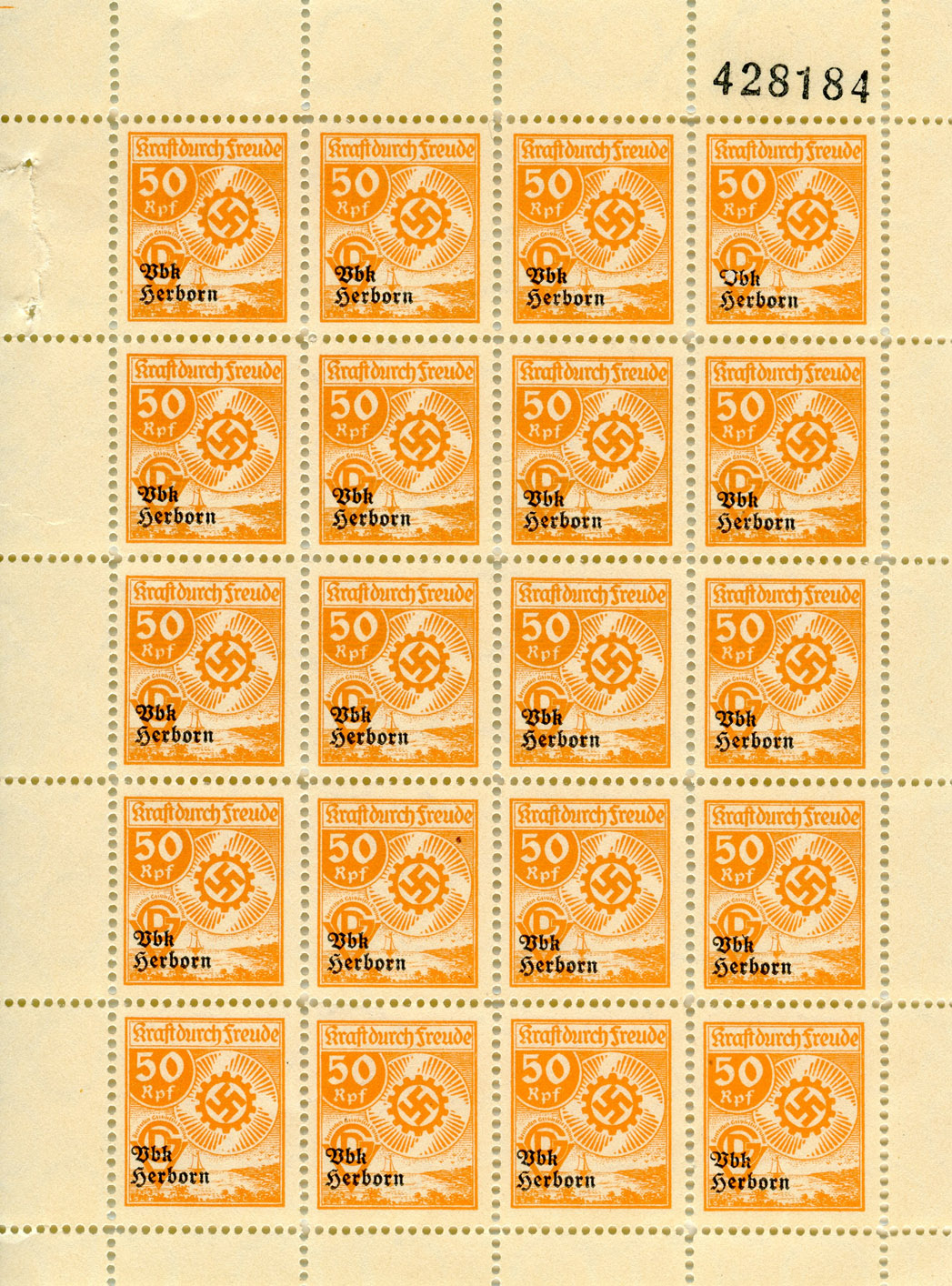 [Below: Sheet of Strength Through Joy tax stamps. Herborn is a historic town in Hesse, Germany.]