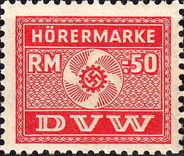 [Below: This 'Hörermarke' is another Strength Through Joy stamp, although I'm unsure what it was for. 'Hörer' means 'listener', perhaps this had something to do with the radio?]