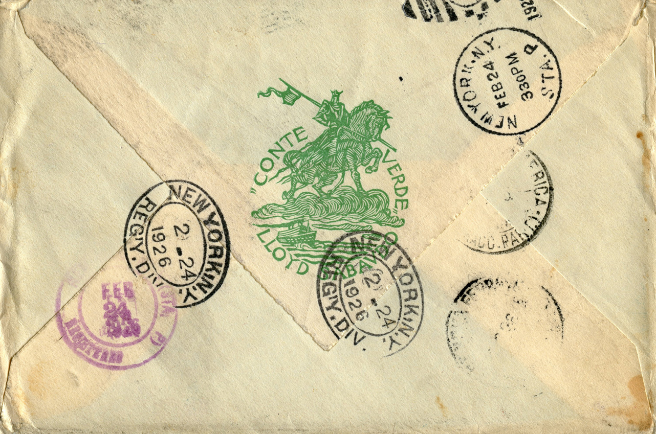 [Below: This was sent from the Conte Verde of the Lloyd Sabaudo shipping line, in an official envelope, to another ship of the LLoyd Sabaudo Line, c/o Dotti Ricccardo, the radio telegrapher of the S.S. Conte Biancamano, harbored in New York. It was sent registered from Genova, Italy on February 12, 1926, and received in New York on February 24, 1926.