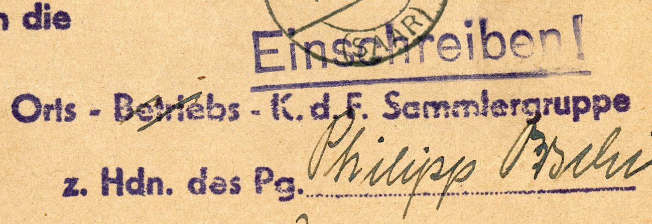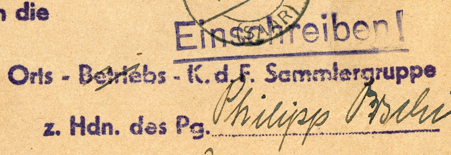 [Below: This was sent registered to the Strength Through Joy organization from the Saar on February 14, 1944.]
