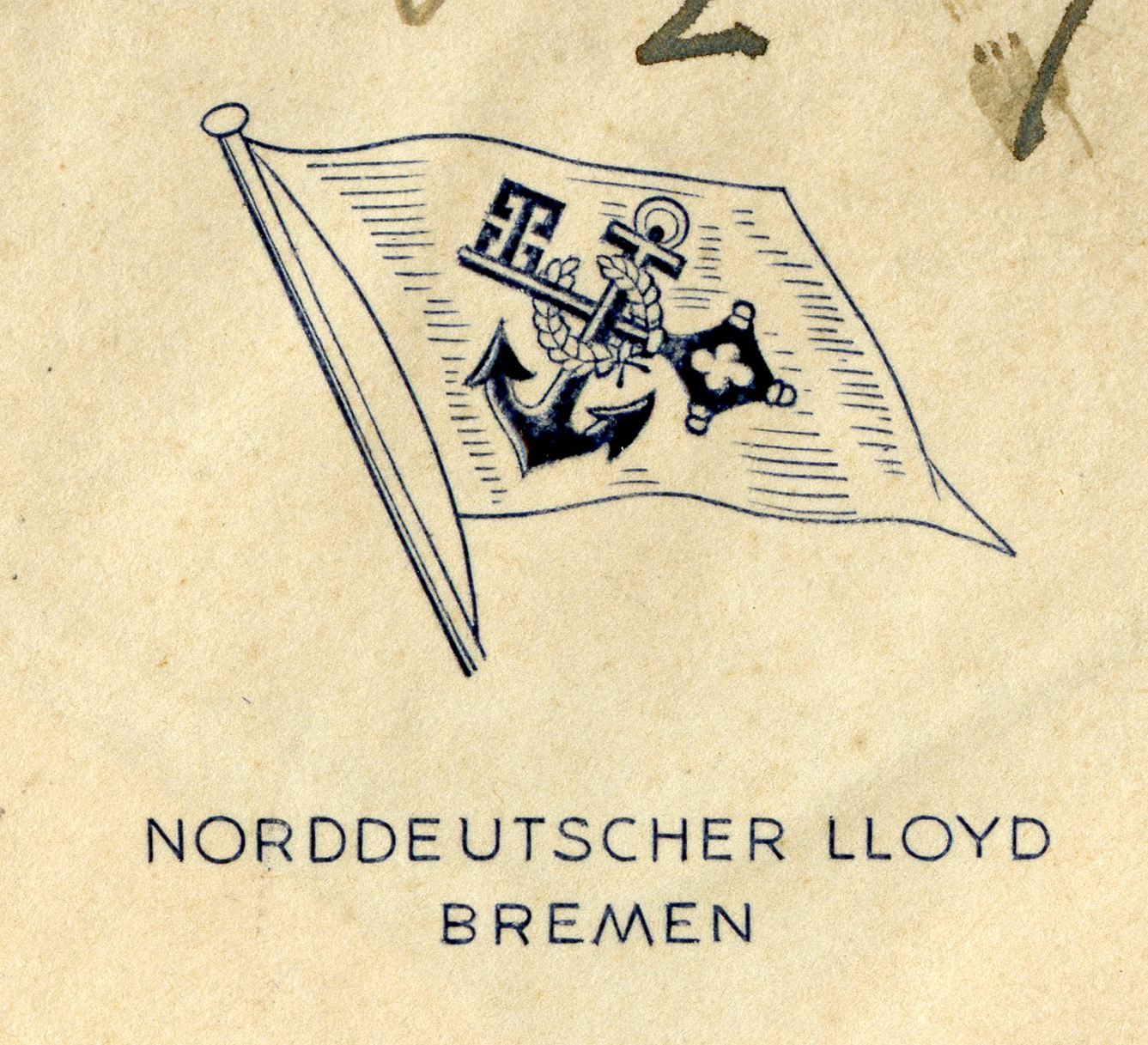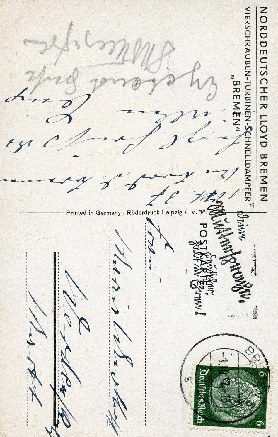 [Below: Here is a postcard canceled on October 1, 1937 from the 'Norddeutscher Lloyd Bremen - Vierschrauben-Turbinen-Schnelldampfer "Bremen"' (North German Lloyd Bremen - Four-Screw Turbine Fast Steamer "Bremen").]