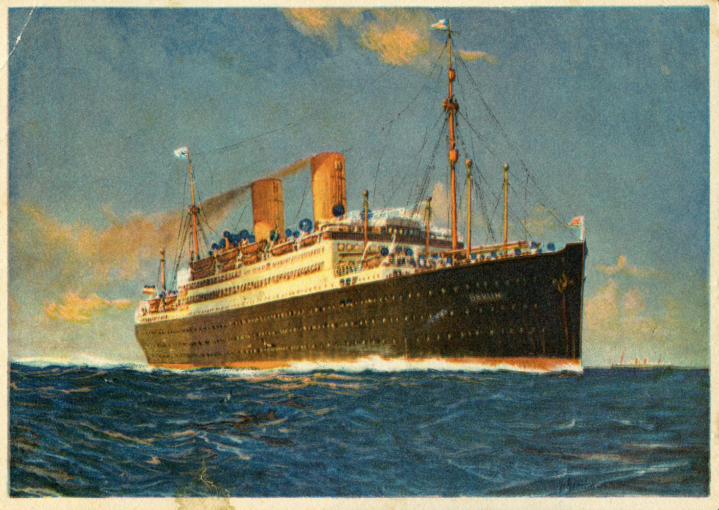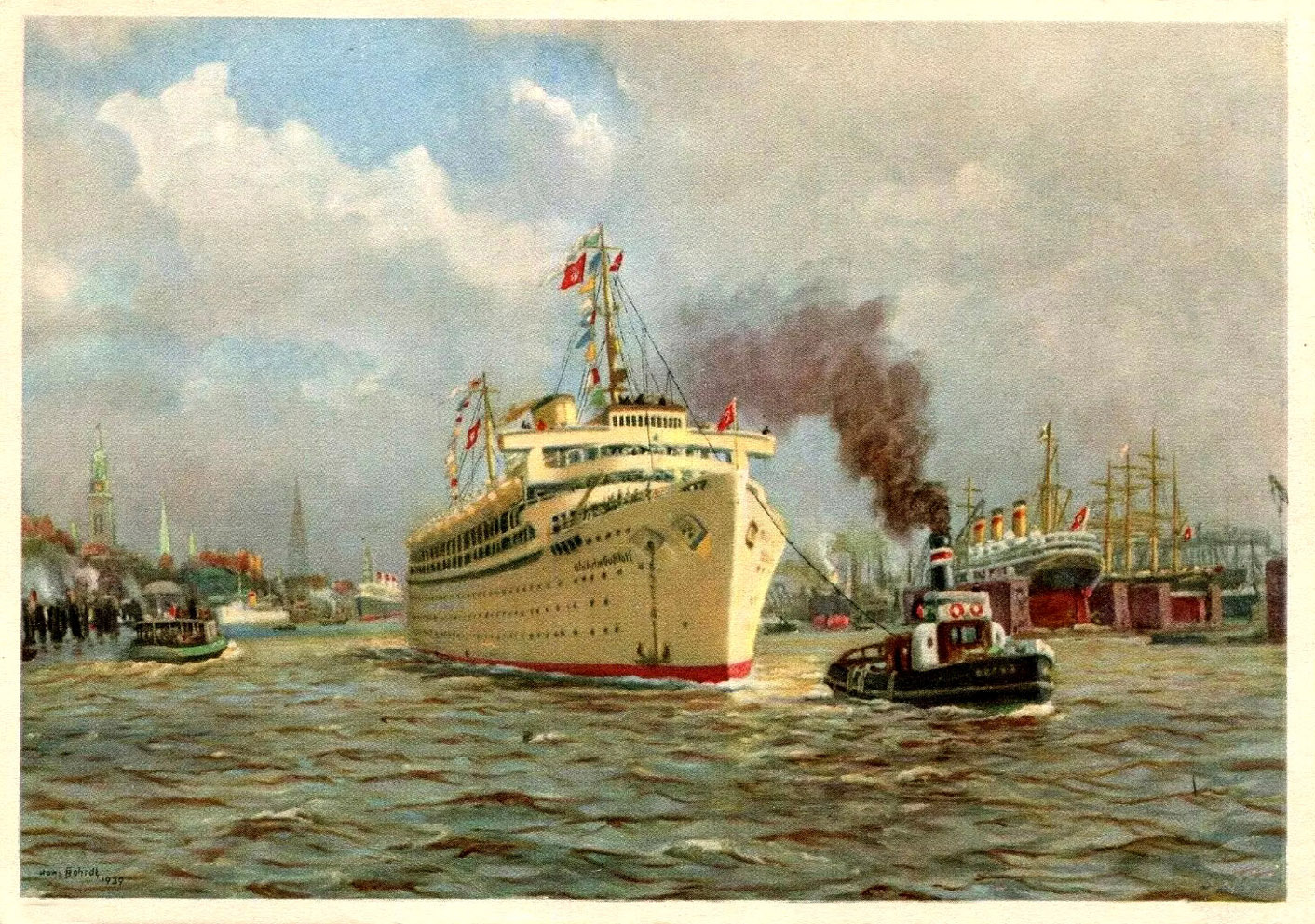 [Below: Postcard of the 'Hansa'. This ship was built in 1923 and was sunk by a mine in the Baltic Sea on March 6, 1945. In 1949 the Russians raised it and repaired it, renaming it Sovetsky Sojus.]