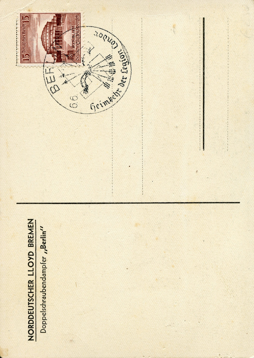 [Below: Here is a postcard canceled on June 6, 1938 from the 'Norddeutscher Lloyd Bremen "Berlin".]