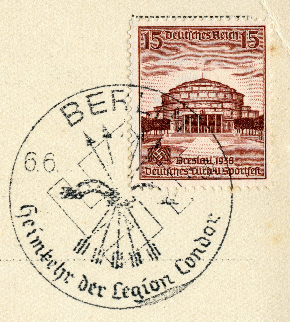 [Below: Note that this postcard was canceled on June 6, 1938 and honors the Condor Legion who fought in Spain on Franco's side.]