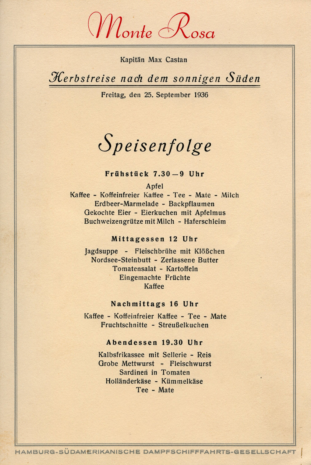 [Below: This is a menu from the 'Monte Rosa' ship on a KDF cruise on September 25, 1936.]