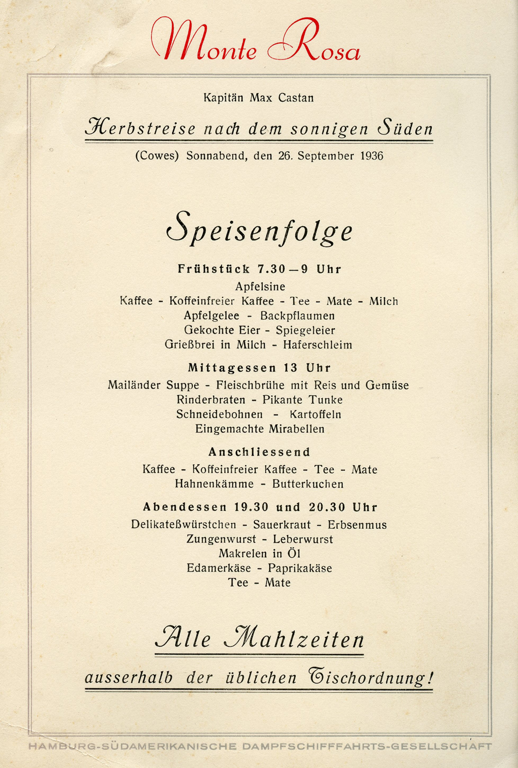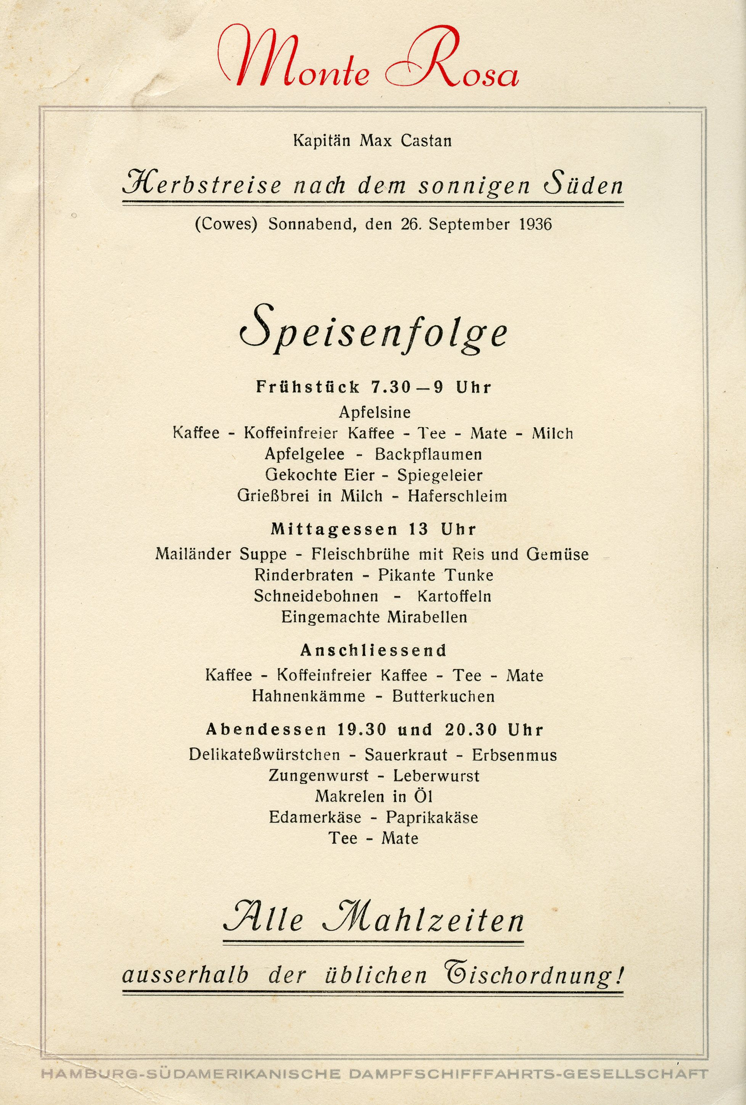 [Below: This is a menu from the 'Monte Rosa' ship on a KDF cruise on September 26, 1936.]