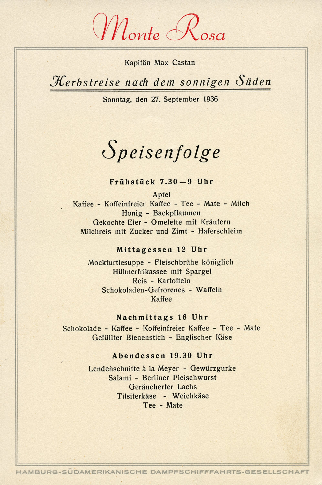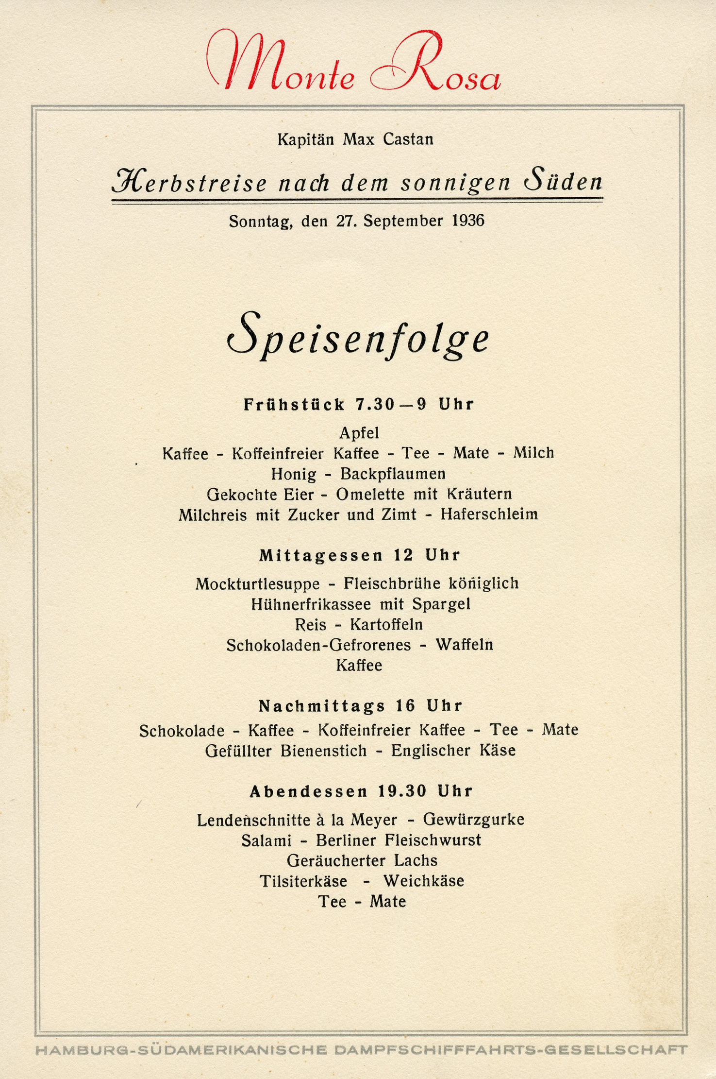 [Below: This is the menu from the next day on the 'Monte Rosa' ship on a KDF cruise on September 27, 1936 .]