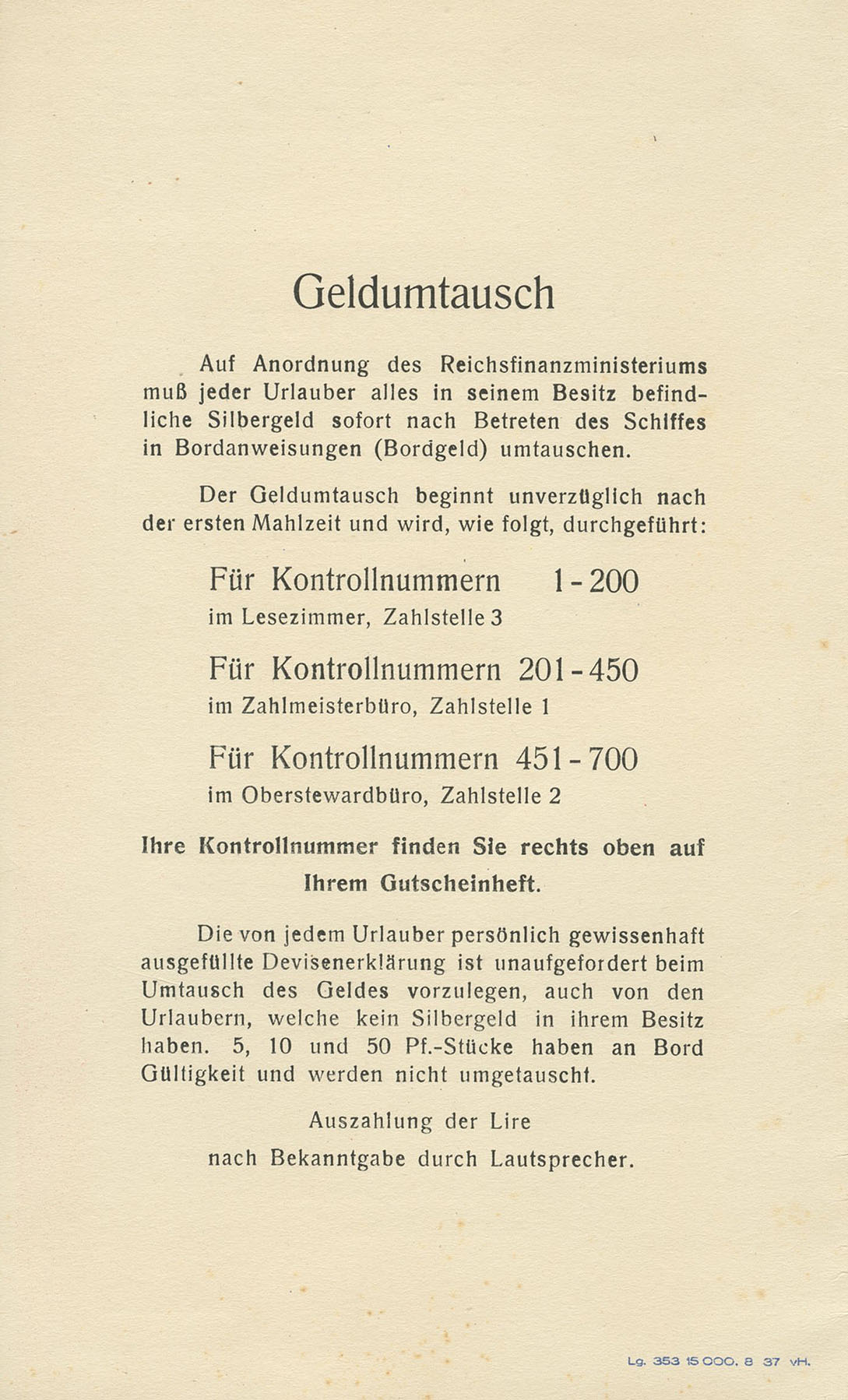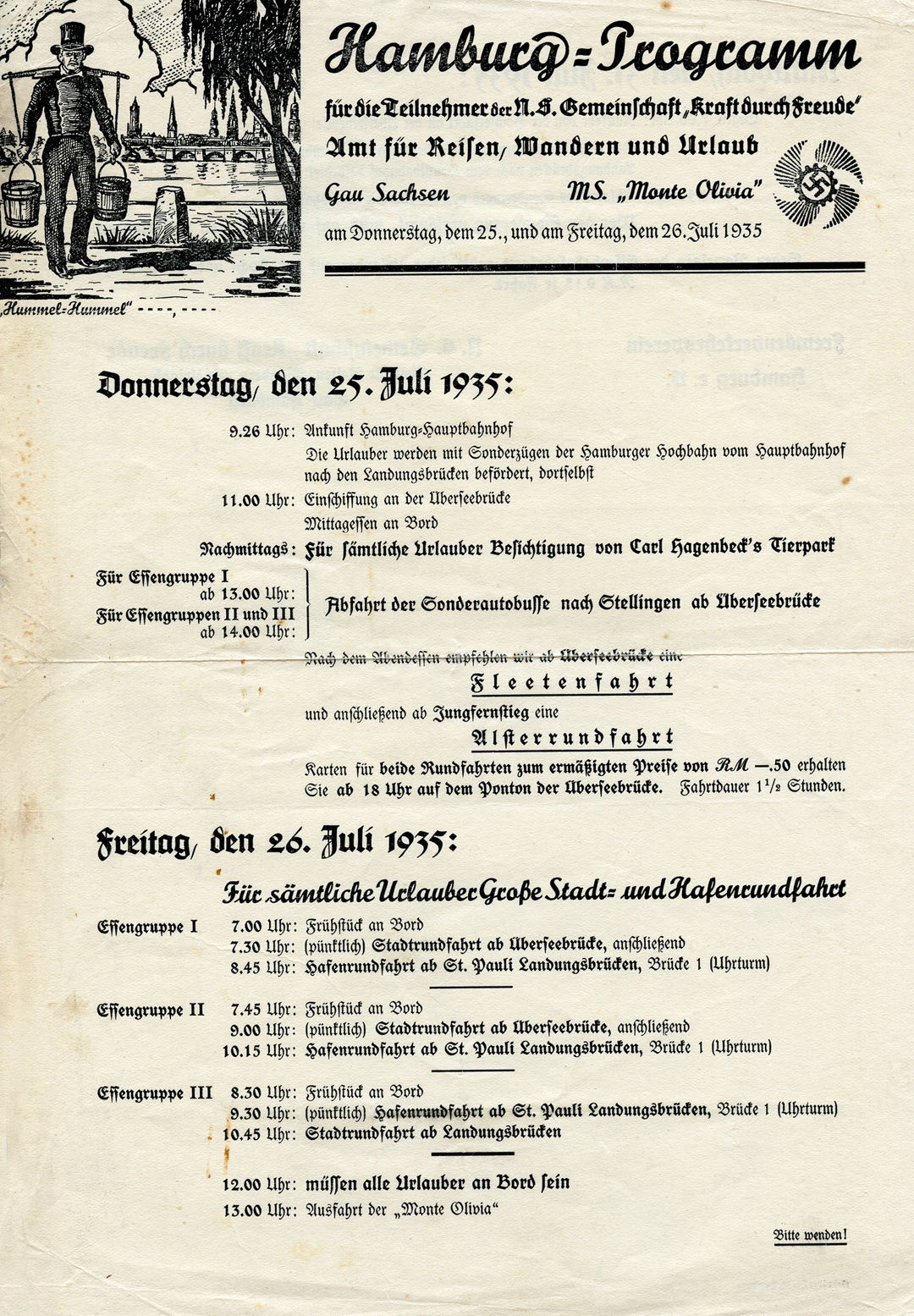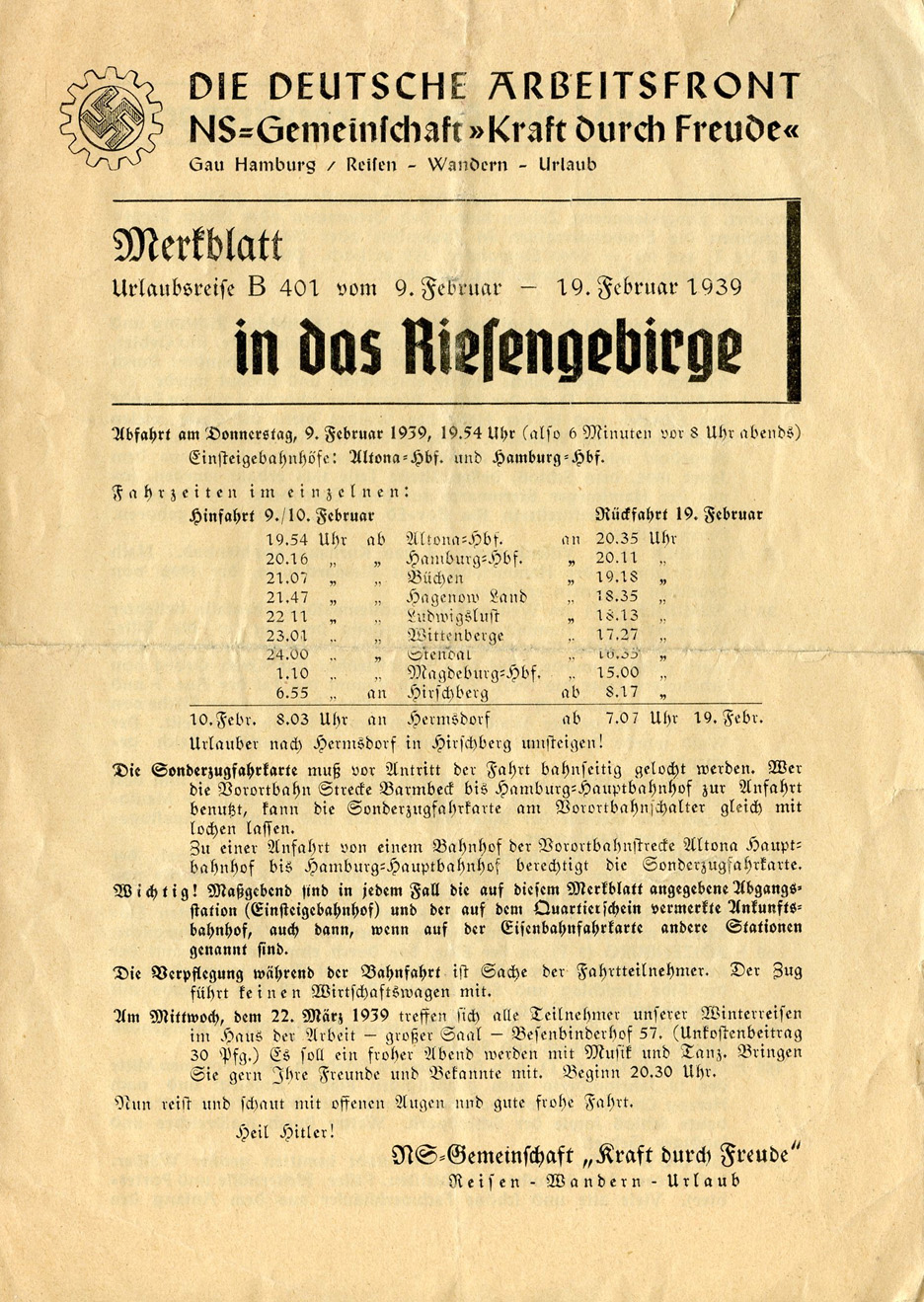[Below: This is a train schedule for a May 1936 Strength Through Joy cruise.]