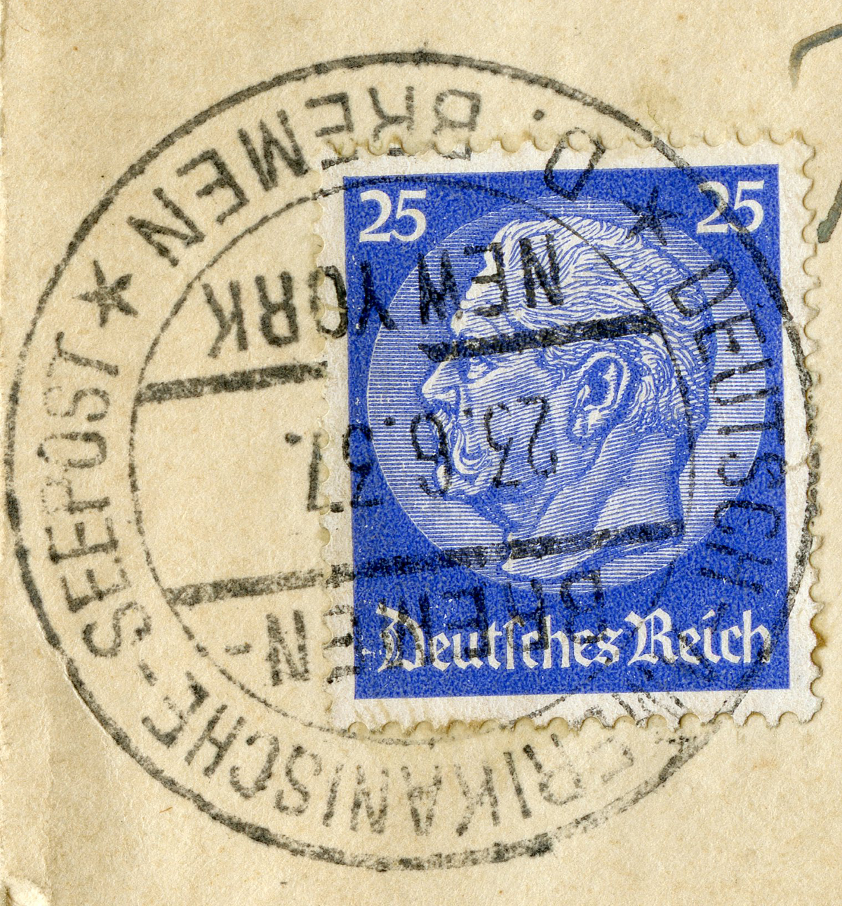 [Below: This was sent from Munich to New York via the S.S. Bremen and postmarked on July 6, 1934. Click to enlarge.]