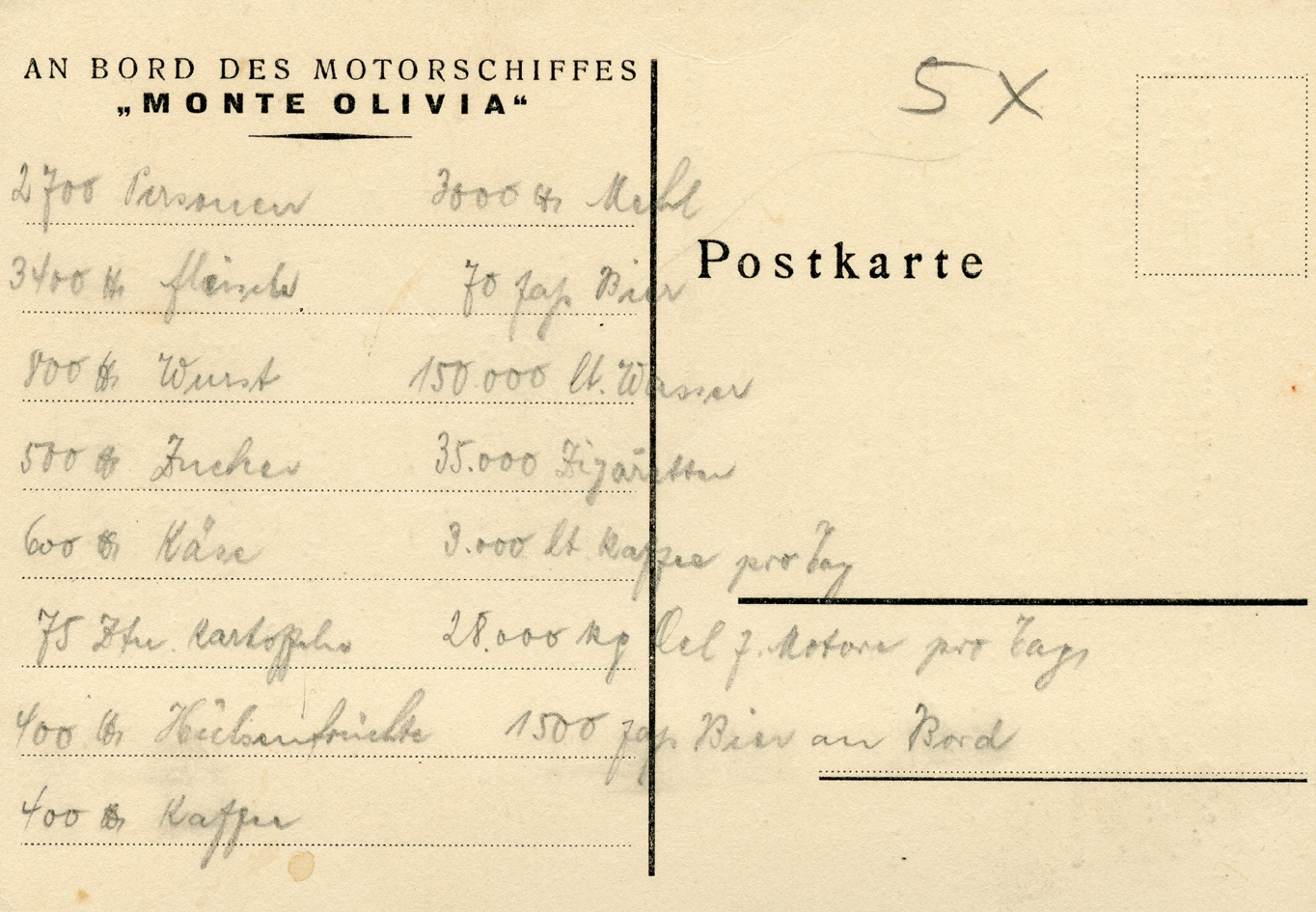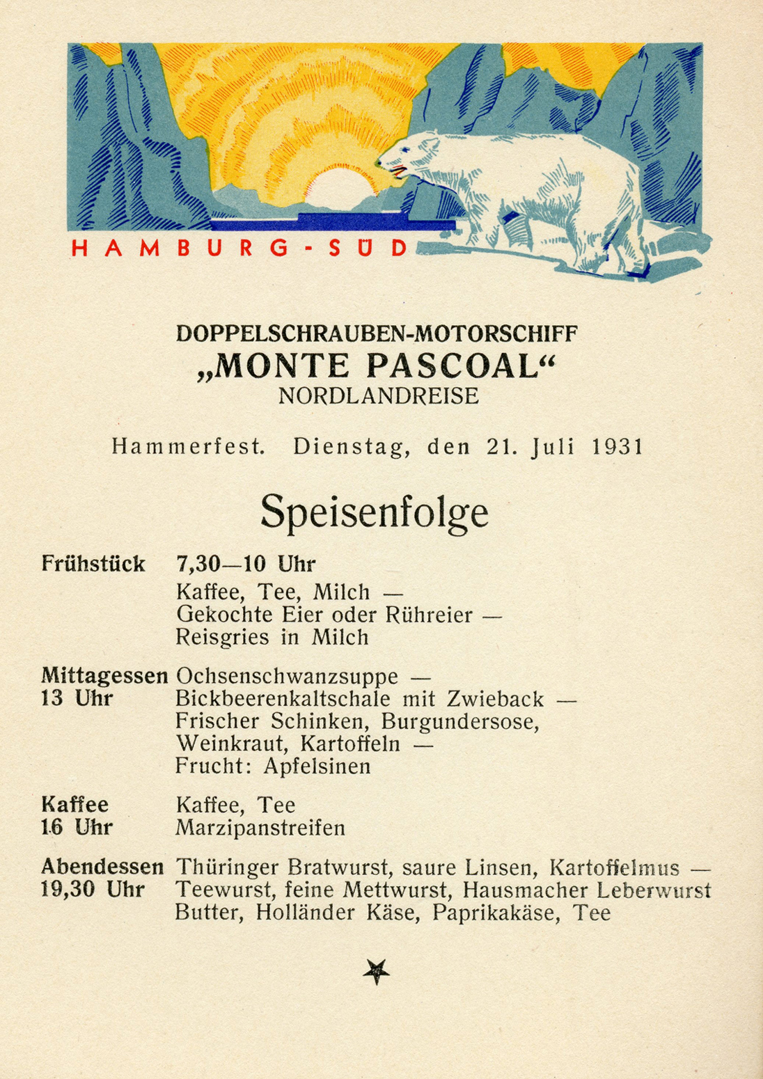 [Below: Menu postcard from a cruise on the 'Monte Pascoal' from July 21, 1931. Click to enlarge.]