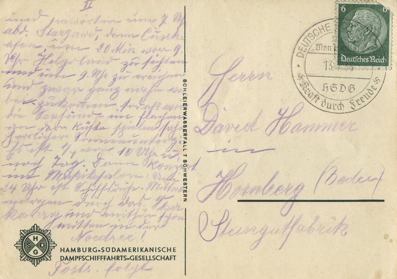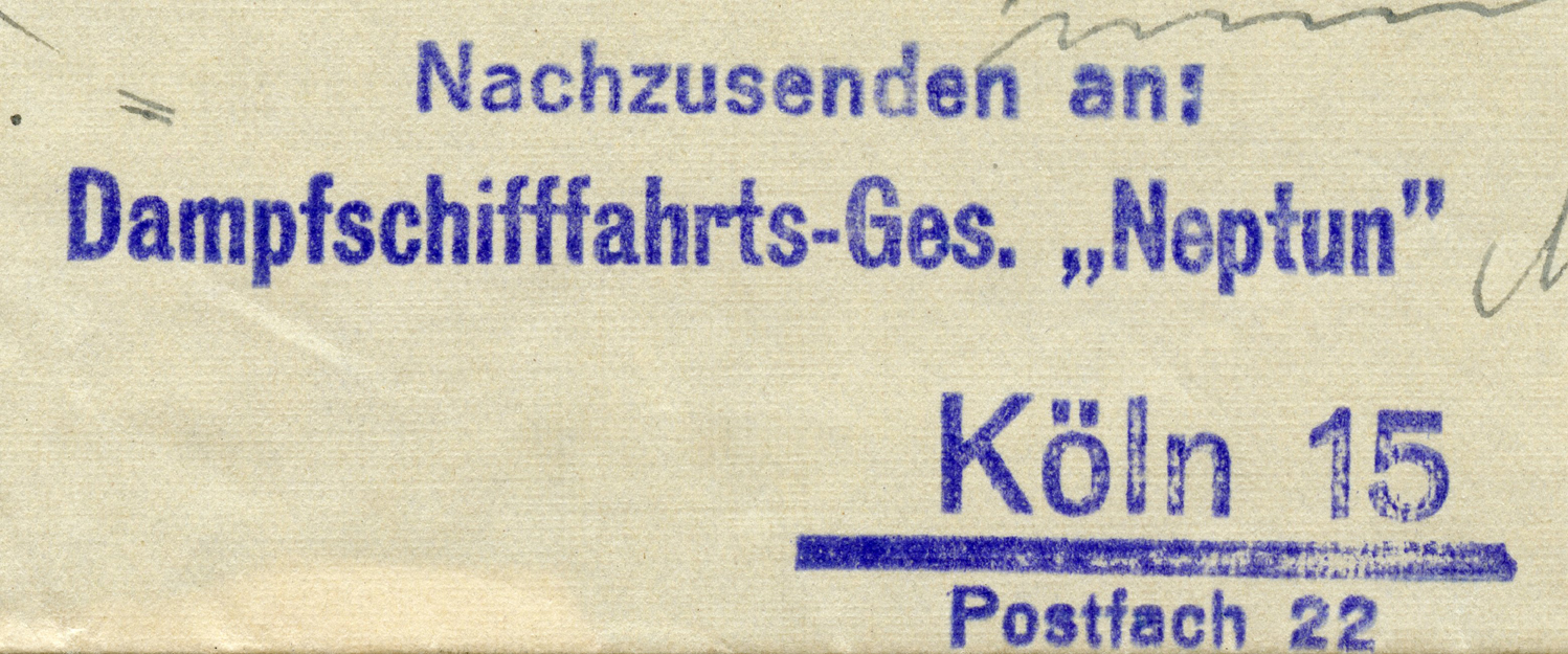 [Below: Postmarked in Bremen, on May 13, 1937, to a steamer ship then re-directed to the S.S. Neptun ship. Click to enlarge.]