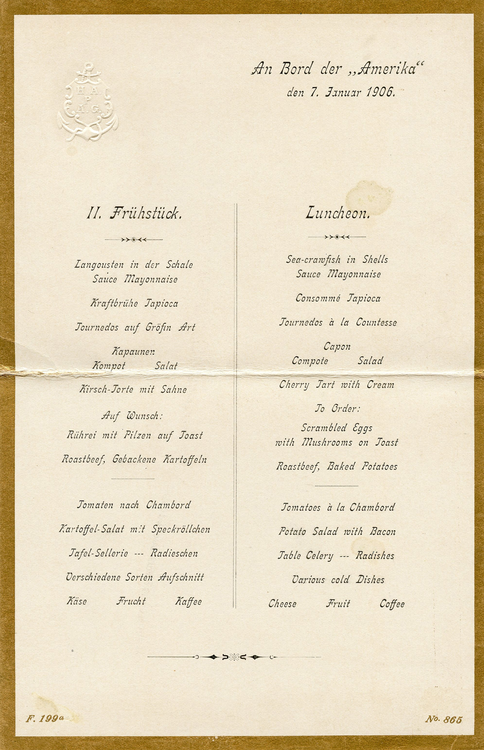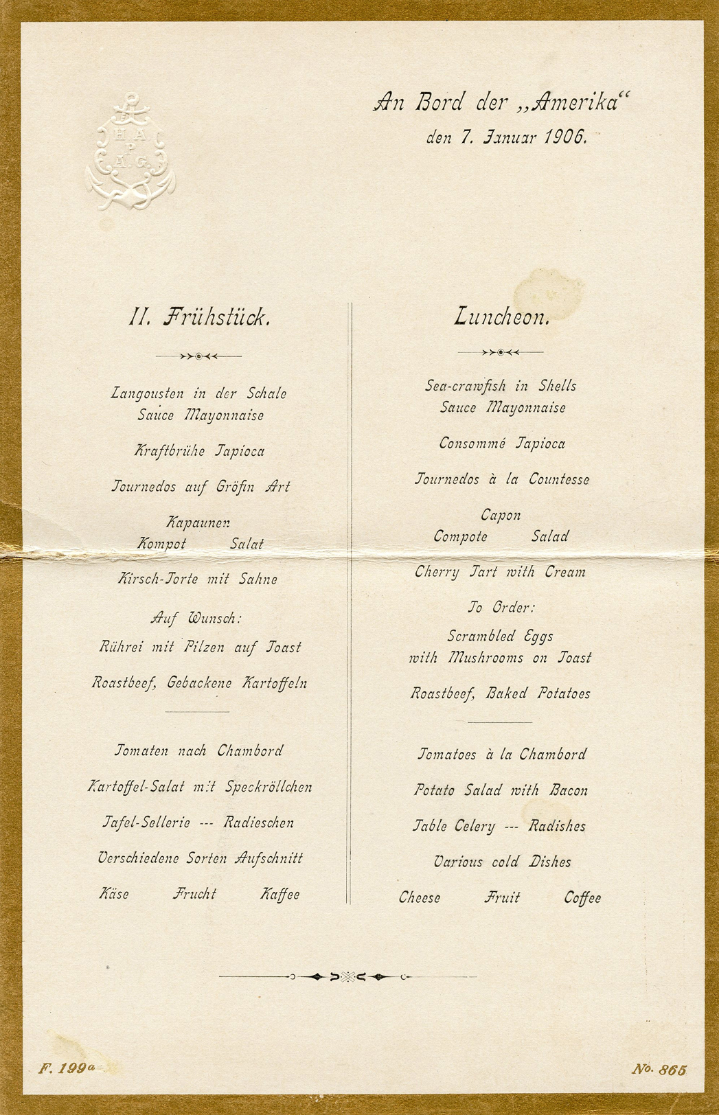 [Below: This is a menu from from the S.S. Amerika, January 7, 1906. This was part of the Hamburg America Line.]